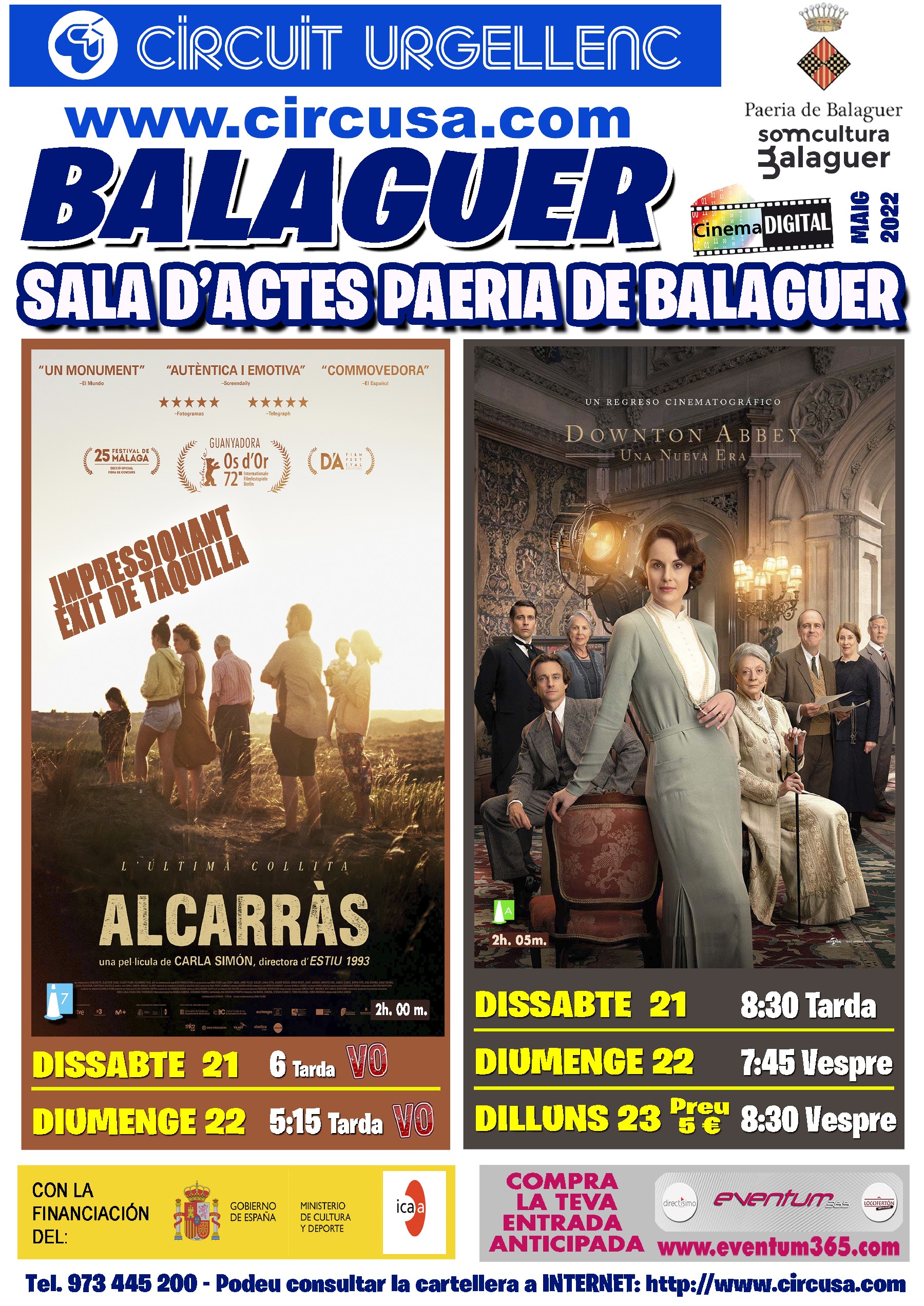 Al Cinema Balaguer continua la projecció per tercera setmana consecutiva de la pel·lícula ''ALCARRÀS''. I també es podrà veure ''DOWNTON ABBEY: UNA NUEVA ERA''