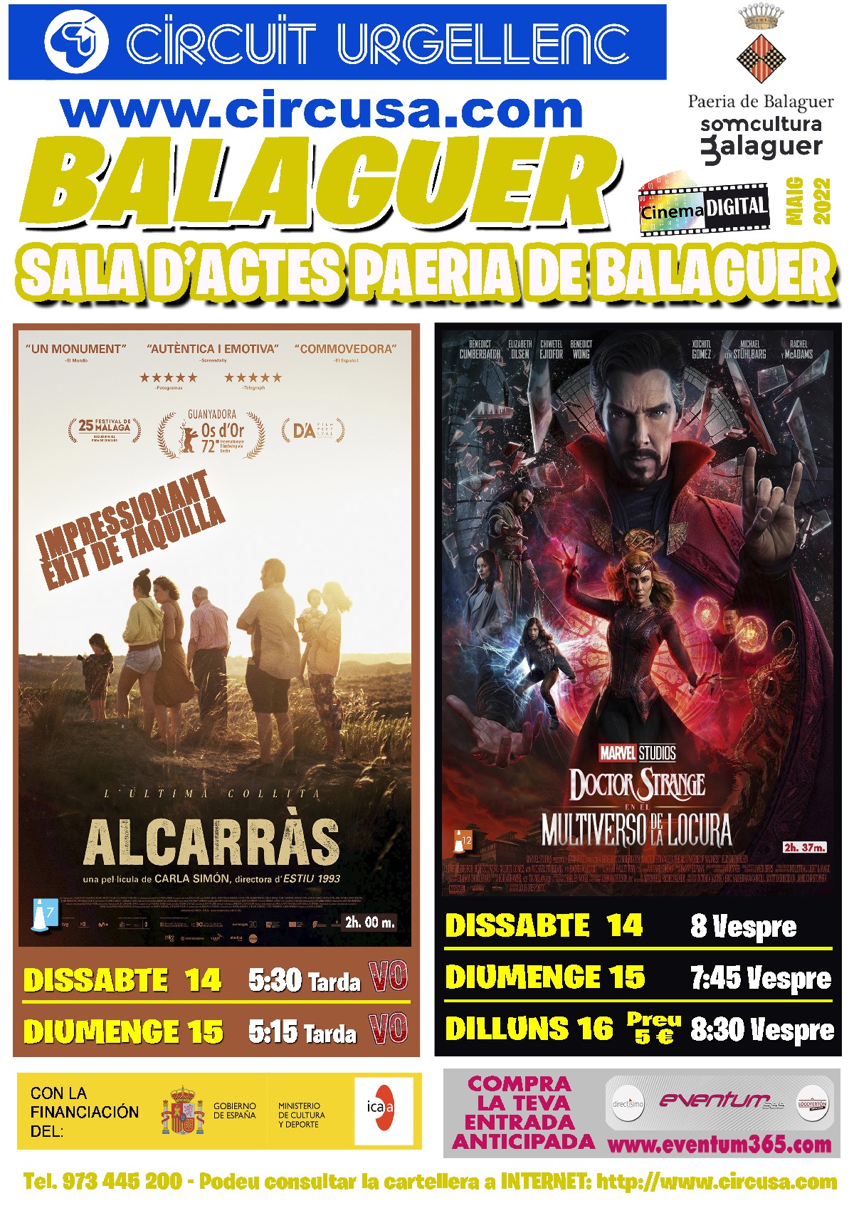 Al Cinema Balaguer continua la projecció per tercera setmana consecutiva de la pel·lícula ''ALCARRÀS''. I també es podrà veure ''DOCTOR STRANGE, EN EL MULTIVERSO DE LA LOCURA''