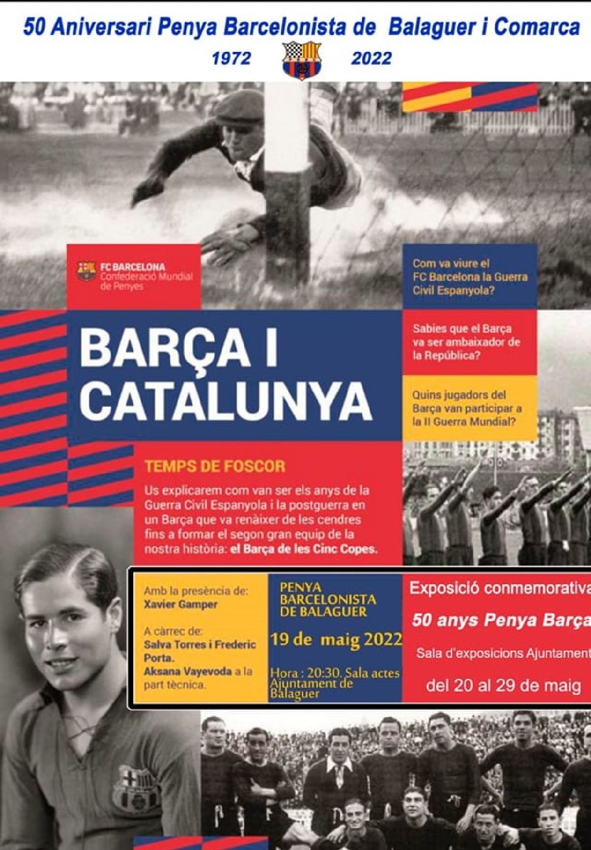 La Penya Barcelonista de Balaguer i Comarca celebra el 50è aniversari 1972-2022 amb diferents activitats com una xerrada 'BARÇA I CATALUNYA '' i un exposició commemorativa ''50 anys Penya Barça''