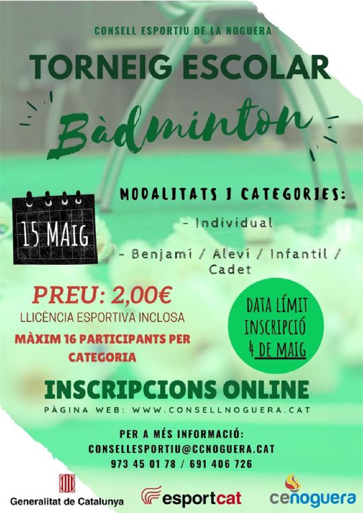 El Consell Esportiu de la Noguera organitza el 1r Torneig de Bàdminton Escolar, el diumenge dia 15 de maig al pavelló Inpacsa de Balaguer