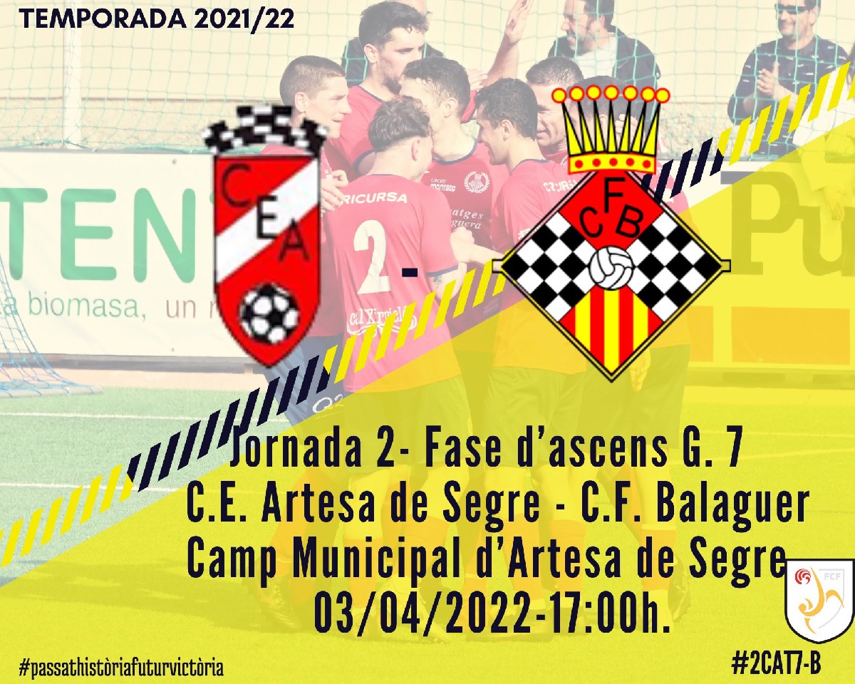 El primer equip del Club Futbol Balaguer juga aquest diumenge el segon partit de la fase d'ascens, que esdevindrà un derbi comarcal en enfrontar-lo a l'Artesa de Segre. El partit es jugarà a Artesa a les 5 de la tarda