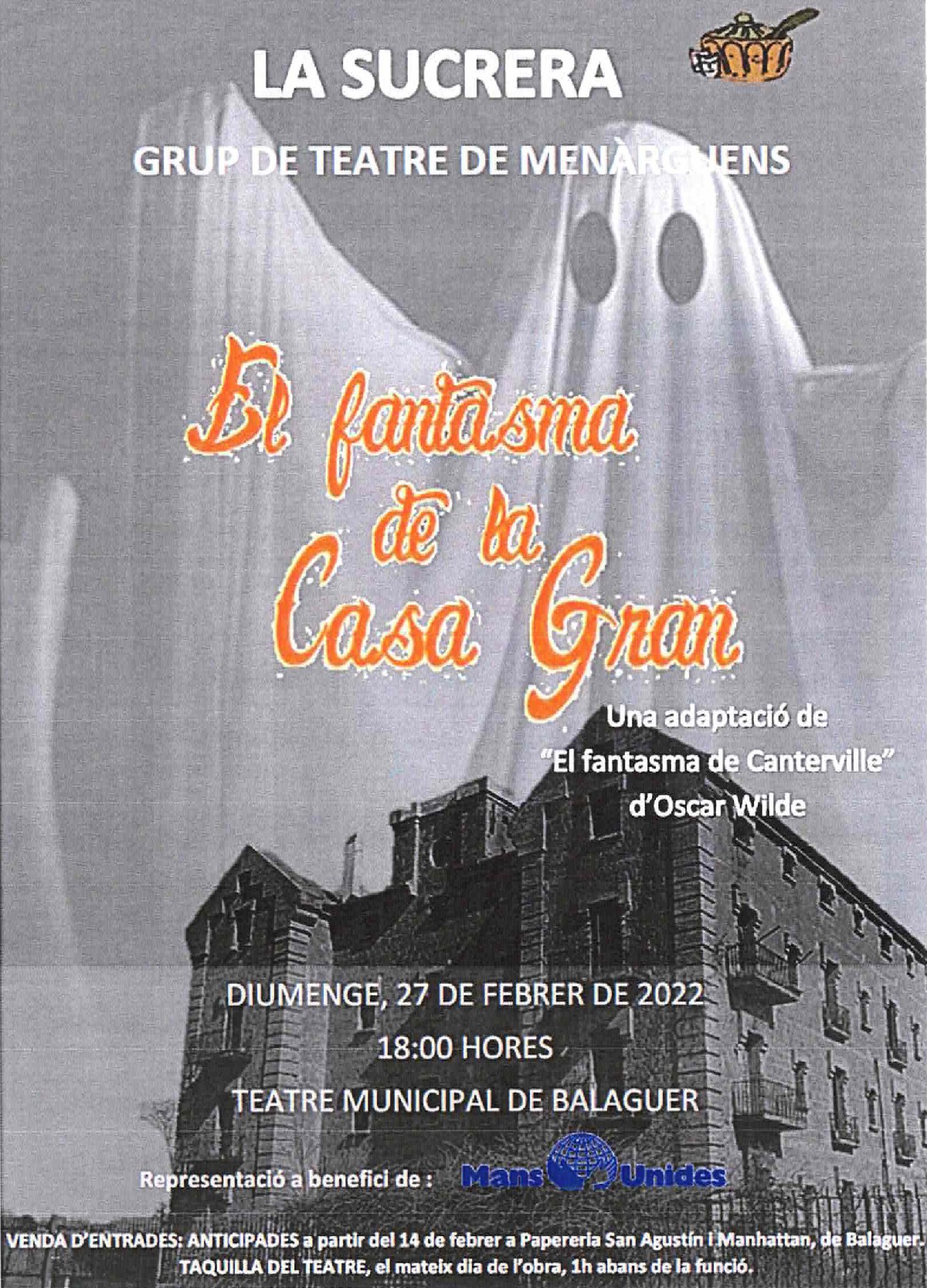 La Sucrera de Menàrguens presentarà aquest diumenge al Teatre Municipal de Balaguer l'obra El Fantasma de la Casa Gran. La recaptació serà en benefici de Mans Unides