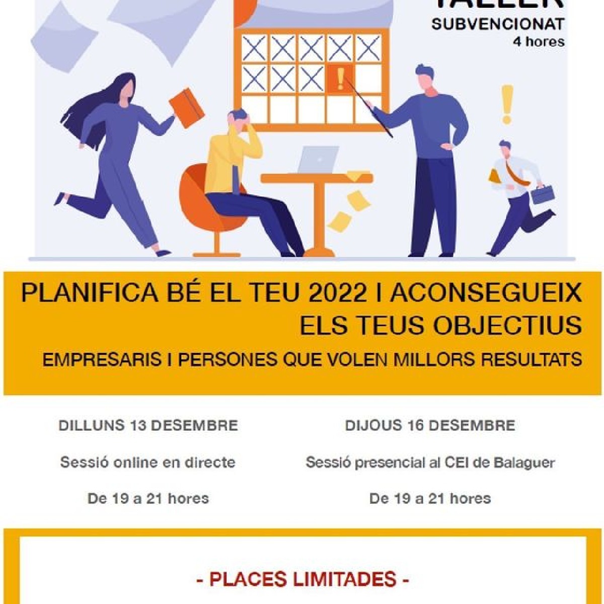 El CEI Balaguer organitza els dies 7 i 10 de febrer el taller FES DEL 2022 EL TEU ANYS: TALLER DE PLANIFICACIÓ EFICAÇ. Es taller es gratuït i està dirigit a empresaris i particulars que busquen millorar resultats