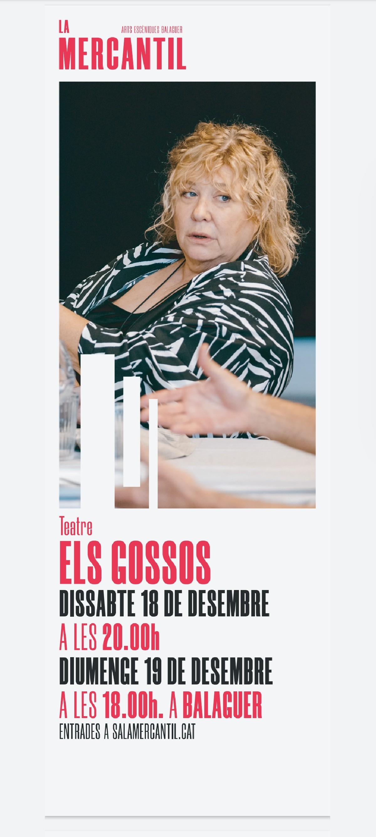 La Sala La Mercantil programa per aquest cap de setmana la representació de l'obra de teatre Els Gossos, interpretada per Mercè Arànega