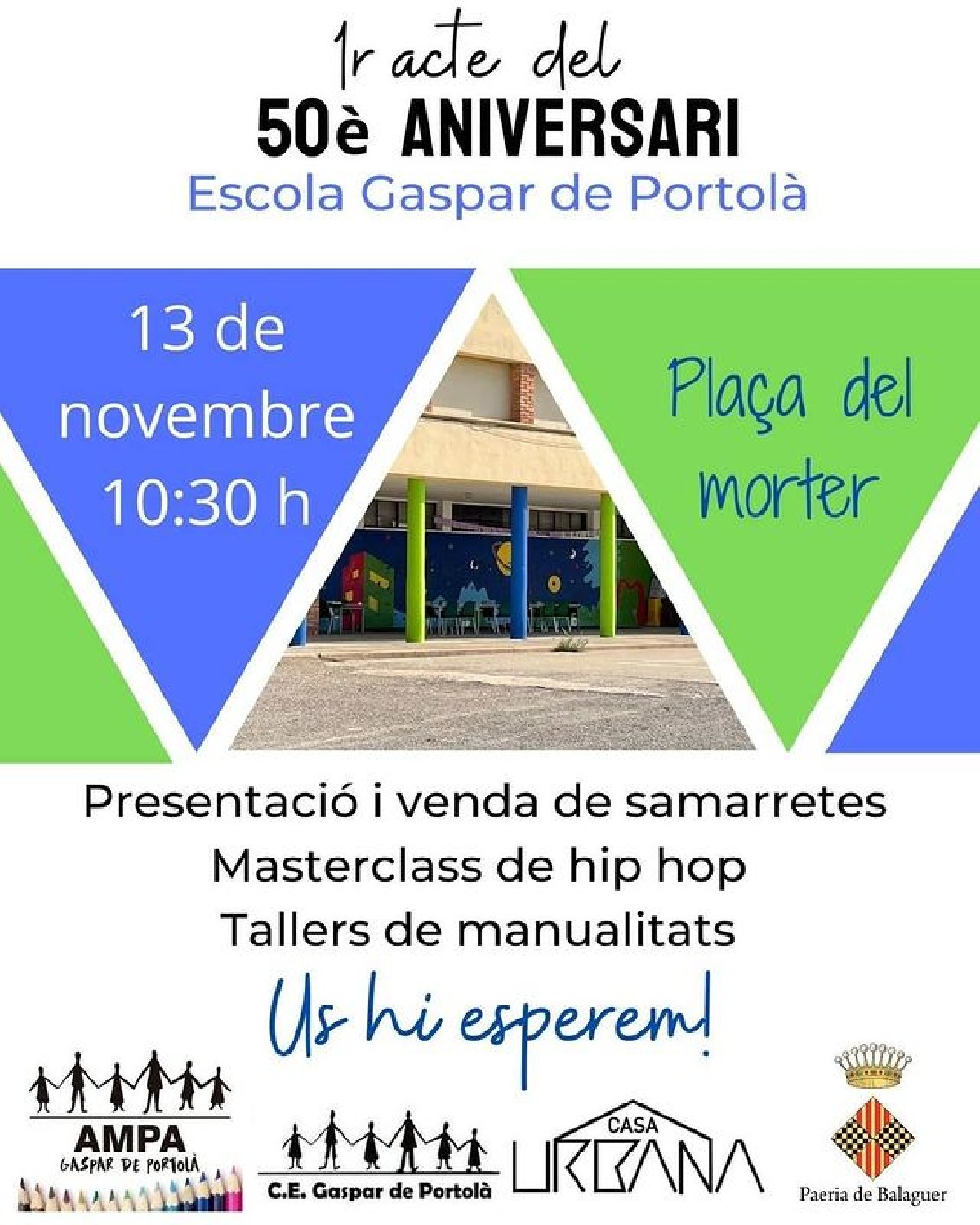 Aquest dissabte 13 de novembre tindrà lloc el 1r acte del 50è aniversari de l'Escola Gaspar de Portolà de Balaguer. Serà a la Plaça del Morter i inclourà la presentació de la samarreta de l'aniversari, que es podrà comprar allí mateix.