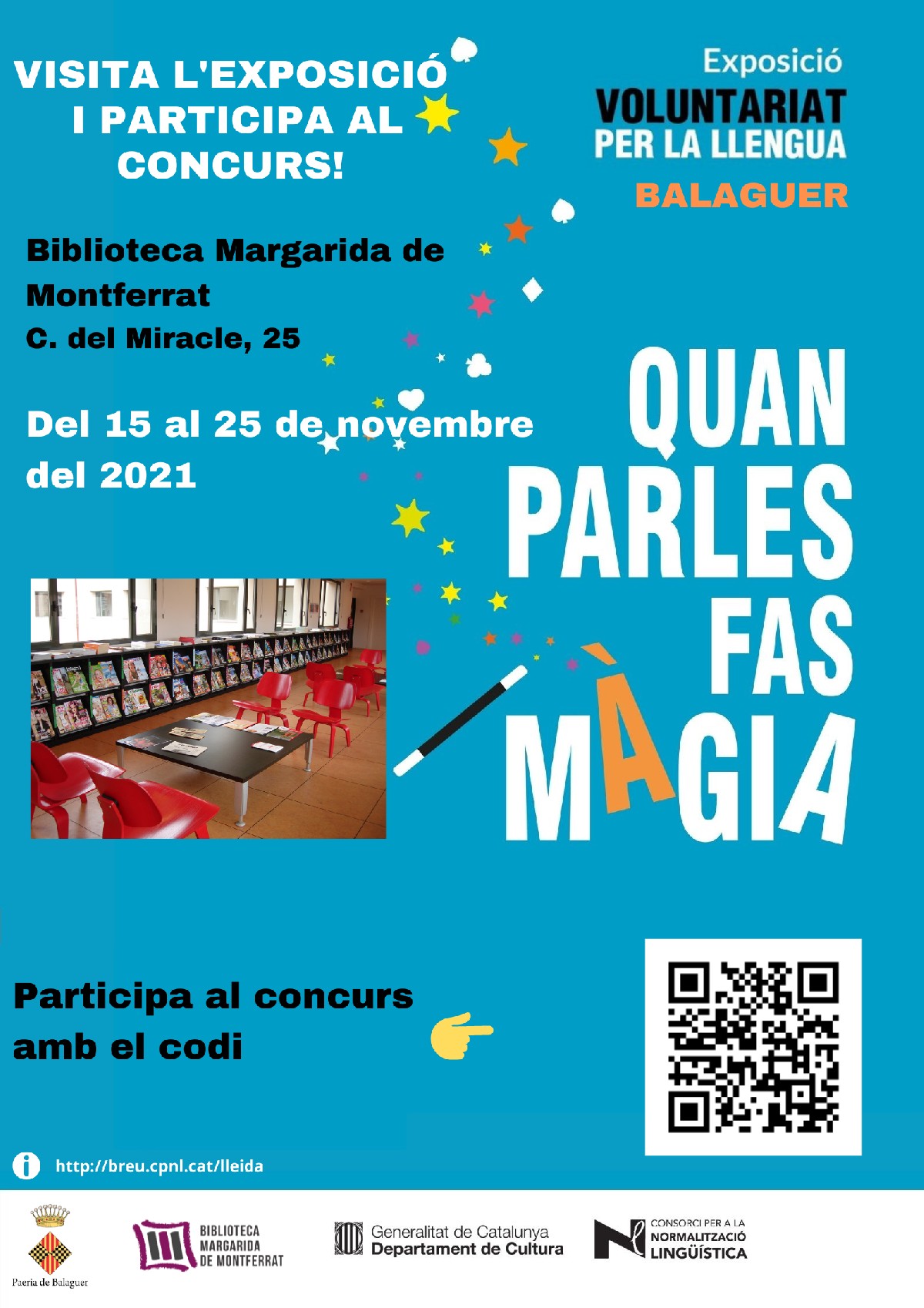La màgia del Voluntariat per la llengua arribarà a la Biblioteca de Balaguer amb l'exposició 'Quan parles fas màgia' . L'exposició es podrà visitar del 15 al 25 de novembre