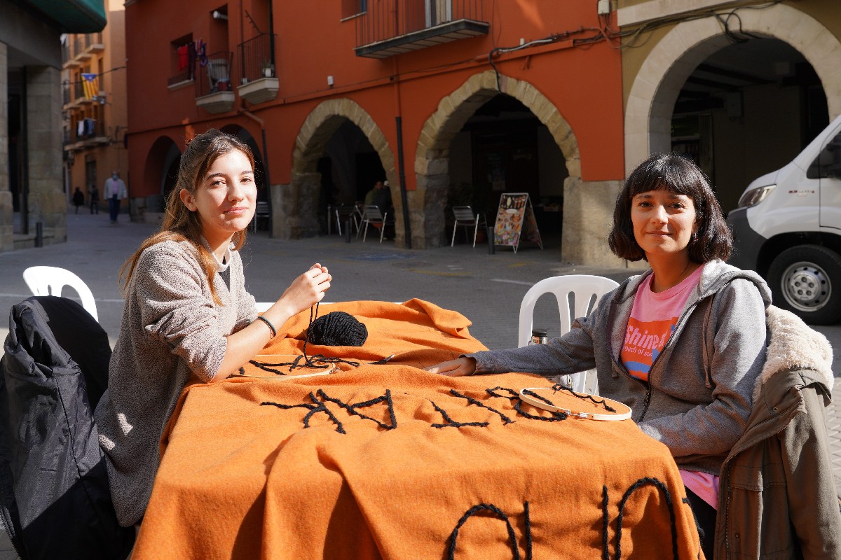 Clara Aguilar i Antonella Pezzola recuperem amb la Performance ¿Cómo habitar una ciudad herida?, la tradició de cosir al carrer i recuperar un espai ara ocupat pel cotxes i les terrasses ...