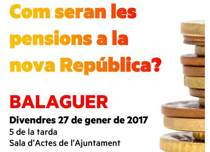 Aquest divendres, a les 5 de la tarda, la Sala d'actes de l'ajuntament acollirà una xerrada sobre com seran les pensions a la nova República. L'acte esta Organitzat per Erc de la Noguera.