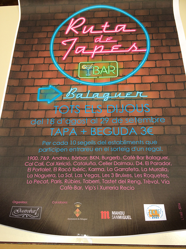 32 bars i restaurants participen aquest any en la Ruta De Tapes per Balaguer organitzada per l'Associació Gastrobar i l'Ajuntament. Es farà tots els dijous des del 18 d'agost i fins el 29 de setembre
