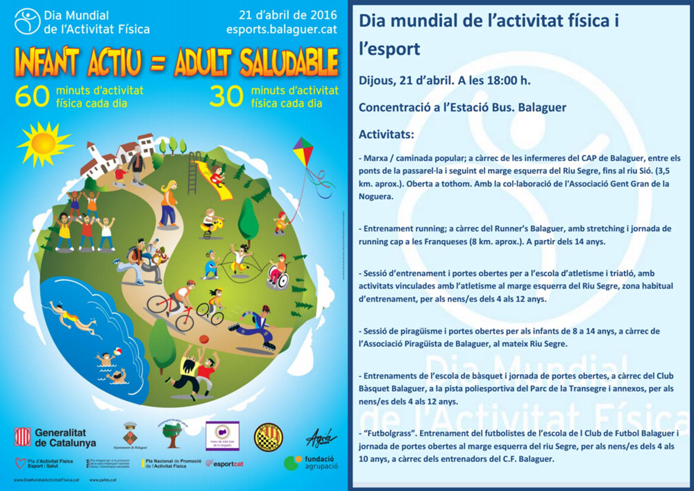 Balaguer celebrarà el proper dijous el Dia Mundial de l'Activitat Física. L'objectiu és sensibilitzar la població de la necessitat de fer exercici com a prevenció i benefici de la salut.