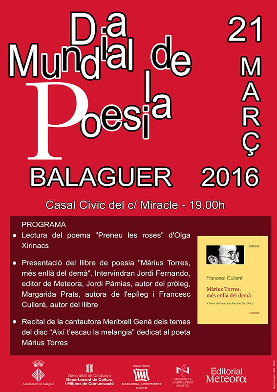 Balaguer se suma avui als actes de commemoració del Dia Mundial de la Poesia. A les 19h al Casal Cívic es presenta el llibre MÀRIUS TORRES, MÉS ENLLÀ DEL DEMÀ del balaguerí Francesc Culleré
