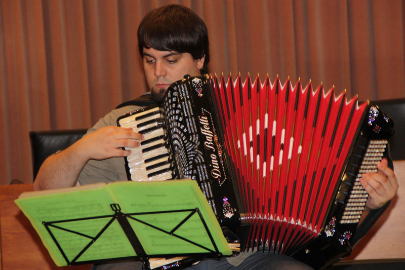 Una vintena d'acordionistes van participar aquest dissabte en la 6ª Trobada d'Acordions Ciutat de Balaguer, que es va haver de celebrar a la Sala d'Actes de l'ajuntament a causa de la pluja.