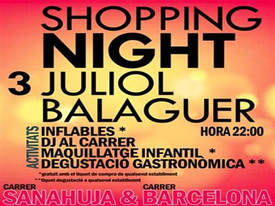 Balaguer celebra avui el primer Shopping Night. Ha estat impulsat per un grup de comerciants dels carrers Sanahuja i Barcelona i tindrà lloc de les deu de la nit a la una de la matinada.