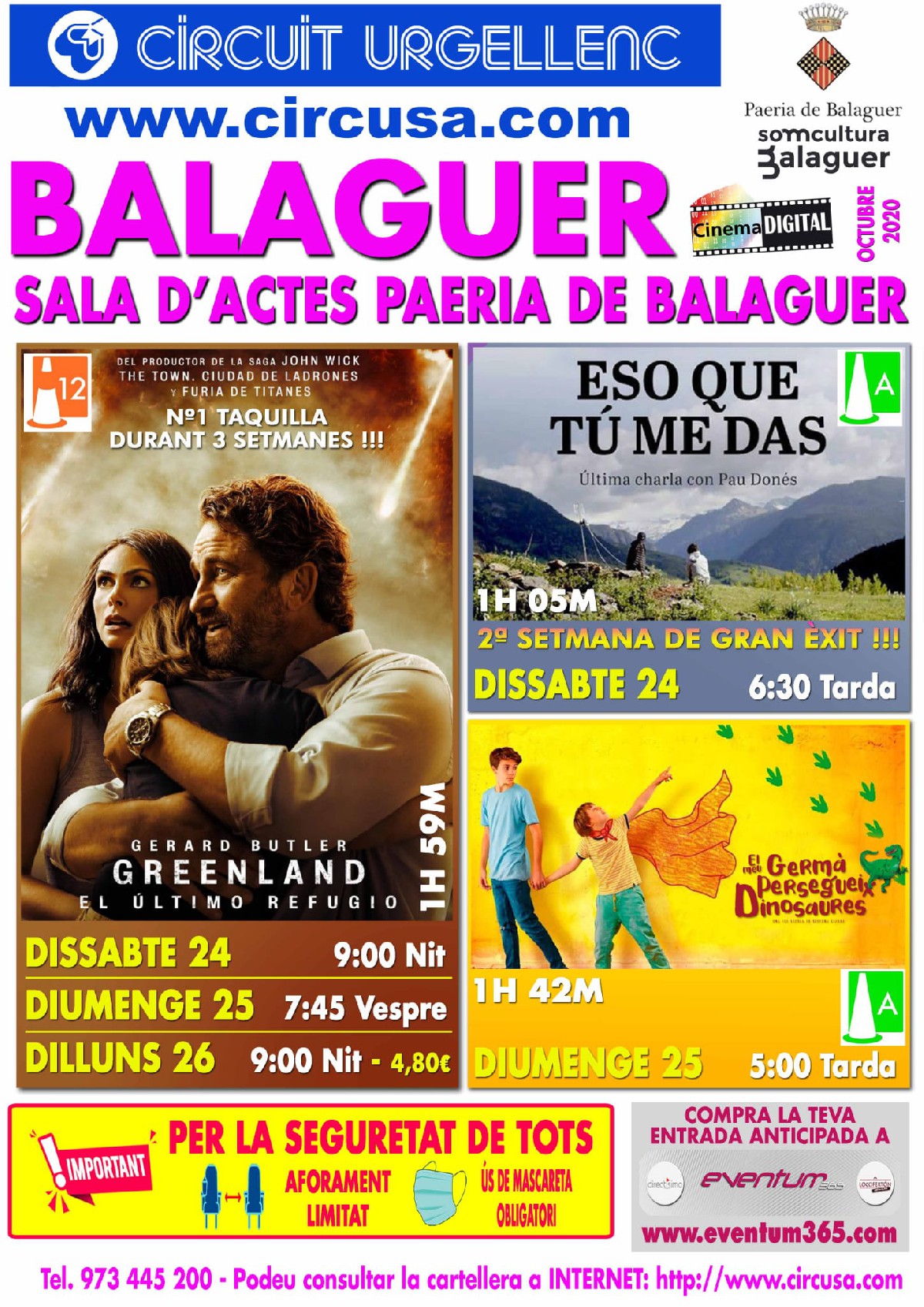 Aquest cap de setmana al Cinema Balaguer és podran veure les pel·lícules: GREENLAND: EL ÚLTIMO REFUGIO i EL MEU GERMÀ PERSEGUEIX DINOSAURES. A més dissabte a la tarda el documental ESO QUE TU ME DAS