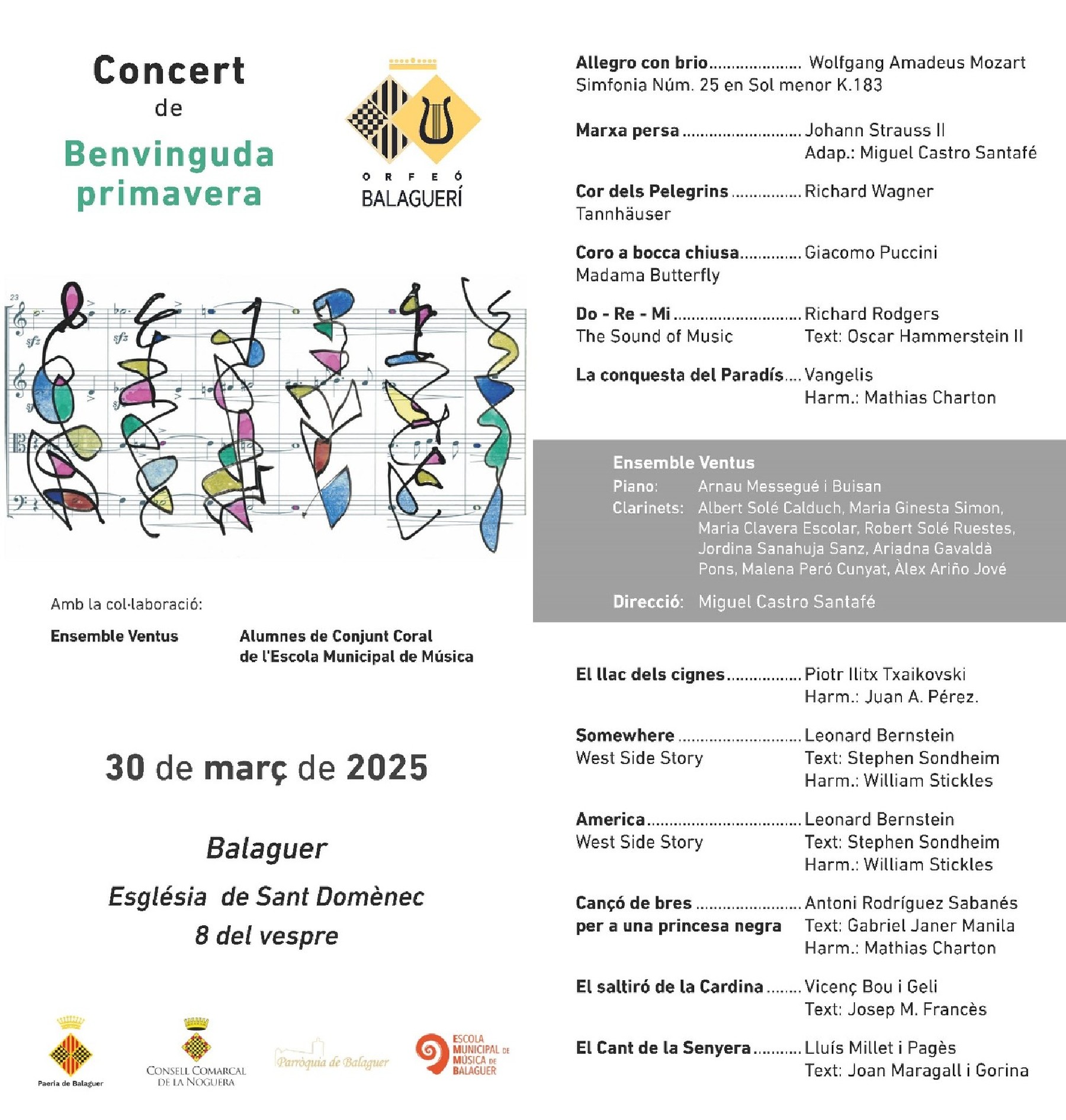 L'Orfeó Balaguerí celebrarà el seu ja tradicional concert 'Benvinguda Primavera', el proper diumenge 30 de març a les 20 h a l'església de Sant Domènec