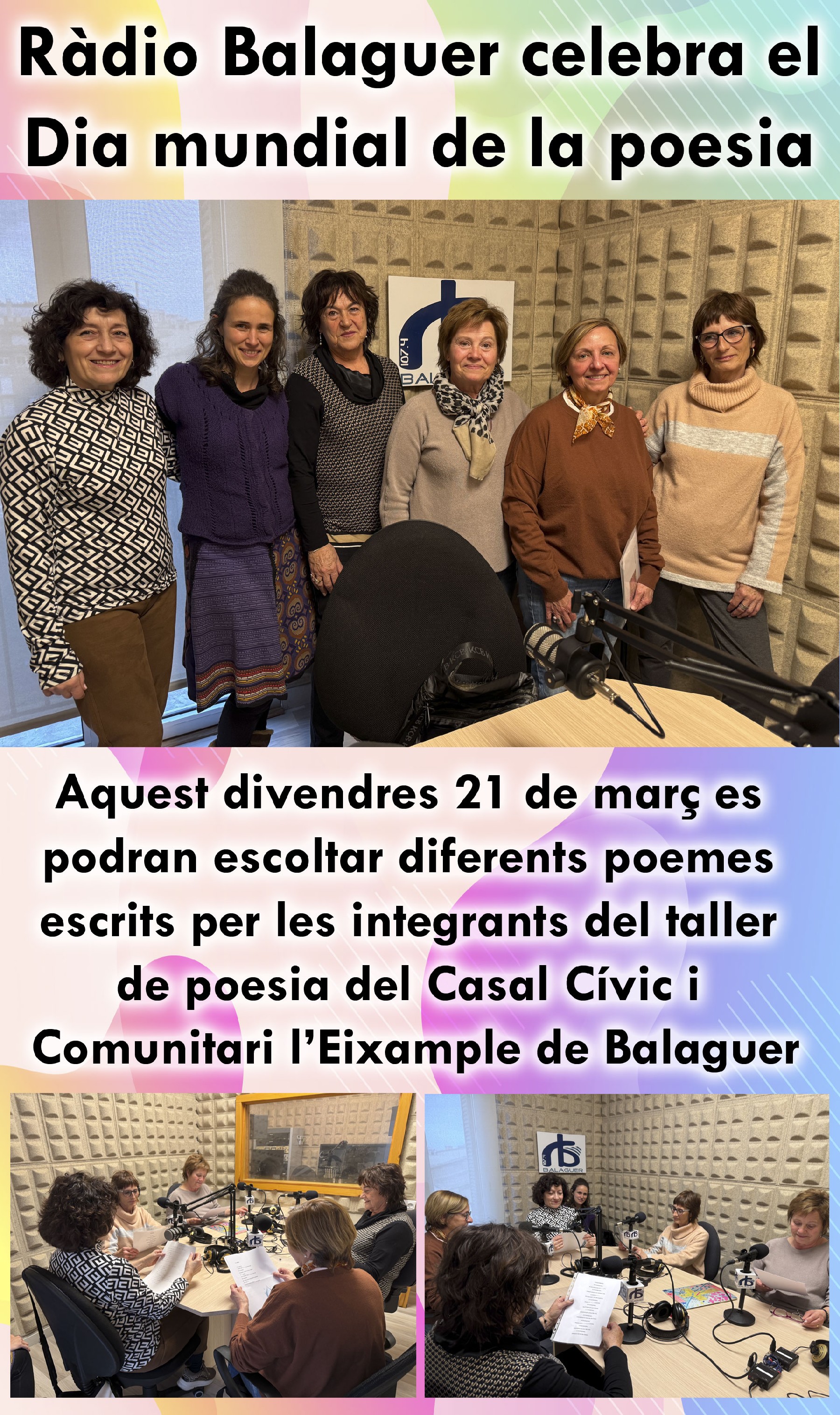 Ràdio Balaguer celebra aquest divendres el Dia Mundial de la Poesia amb lectures del taller d'escriptura poètica del Casal Cívic i Comunitari l'Eixample de Balaguer