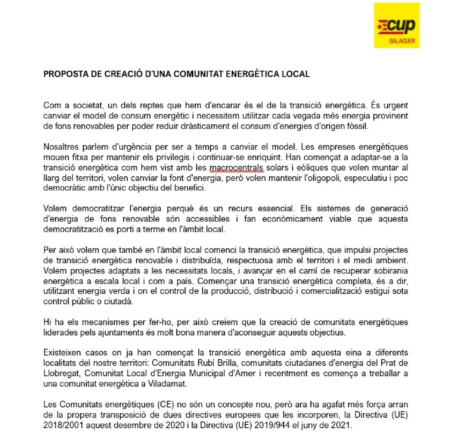 El grup municipal de la CUP a la Paeria de Balaguer presenta aquest dijous, en el ple ordinari d'aquest mes de maig, una moció per crear una comunitat energètica local