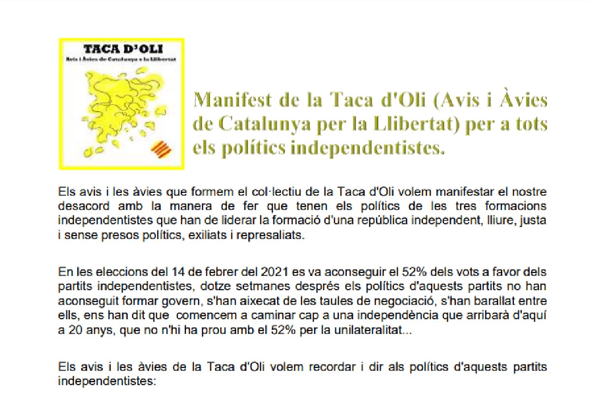 El moviment 'Taca d'Oli' presentarà aquest dijous al Parlament de Catalunya un manifest en què mostren el seu desacord amb la manera de fer de les tres formacions independentistes que han de liderar la formació d'una república independent