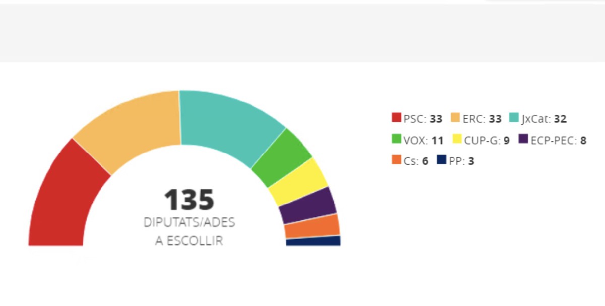 14-F: ERC guanyaria les eleccions amb 36-38 escons, seguida del PSC (34-36) i JxCat (30-33), segons el sondeig de TV3 La CUP aconseguiria 7 diputats; els comuns, Vox i Cs entre 6 i 7; el PP 4 o 5; i el PDeCAT podria entrar amb 2