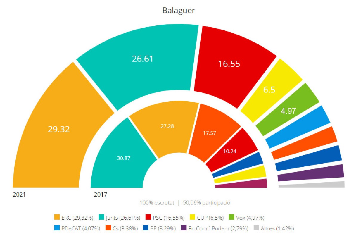 ERC és la força més votada a Balaguer en les eleccions al Parlament de Catalunya del 14F. Ho ha fet aconseguint el 29,32% dels vots. Junts ha estat segona amb el 26.61 i el PSC tercer amb un 16.55. La CUP-G és quarta