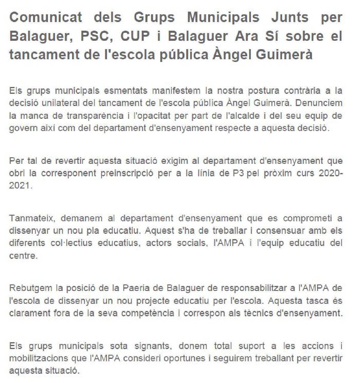 Els grups municipals de Junts per Balaguer, el PSC, la CUP i Balaguer Ara Sí manifesten a través d'un comunicat conjunt la seva postura contrària a la decisió unilateral del tancament de l'escola pública Angel Guimerà.