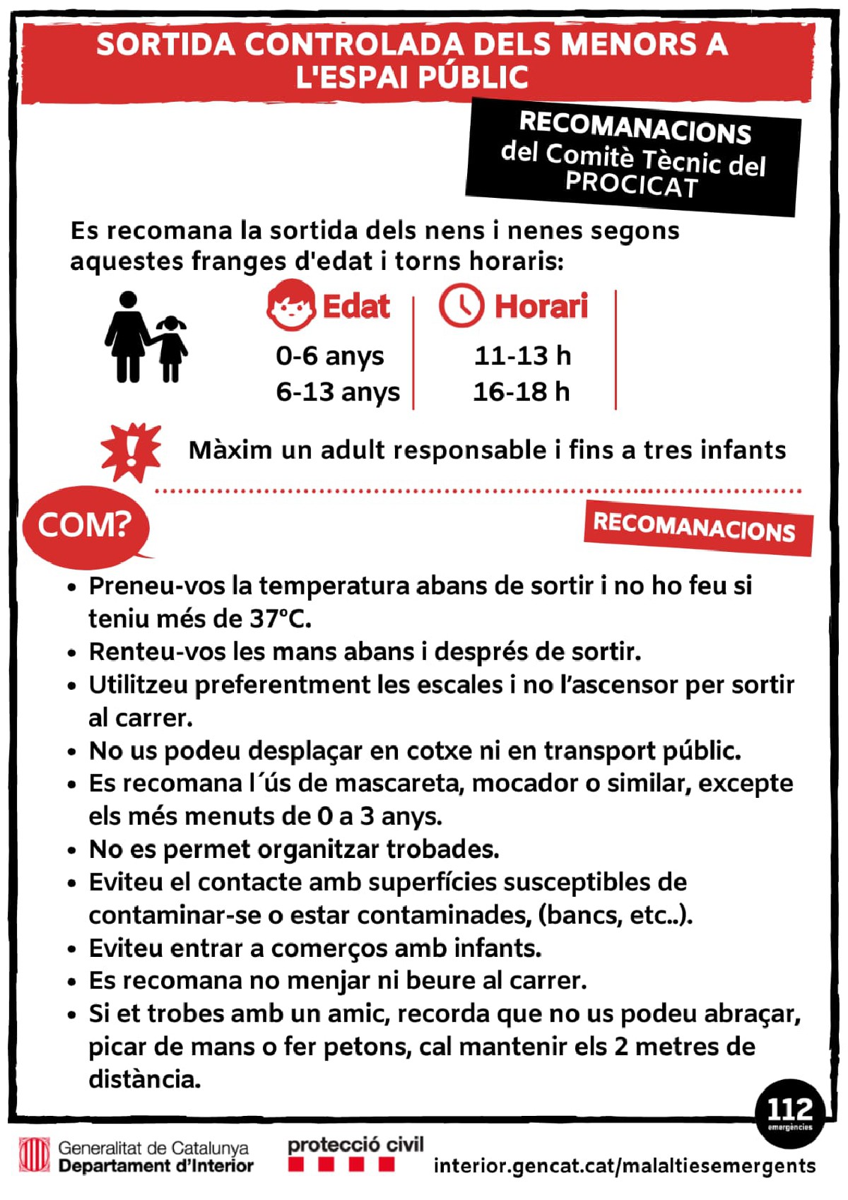 Protecció Civil fa una crida a la coresponsabilitat ciutadana i recomana esglaonar la sortida dels menors al llarg del dia a partir de demà