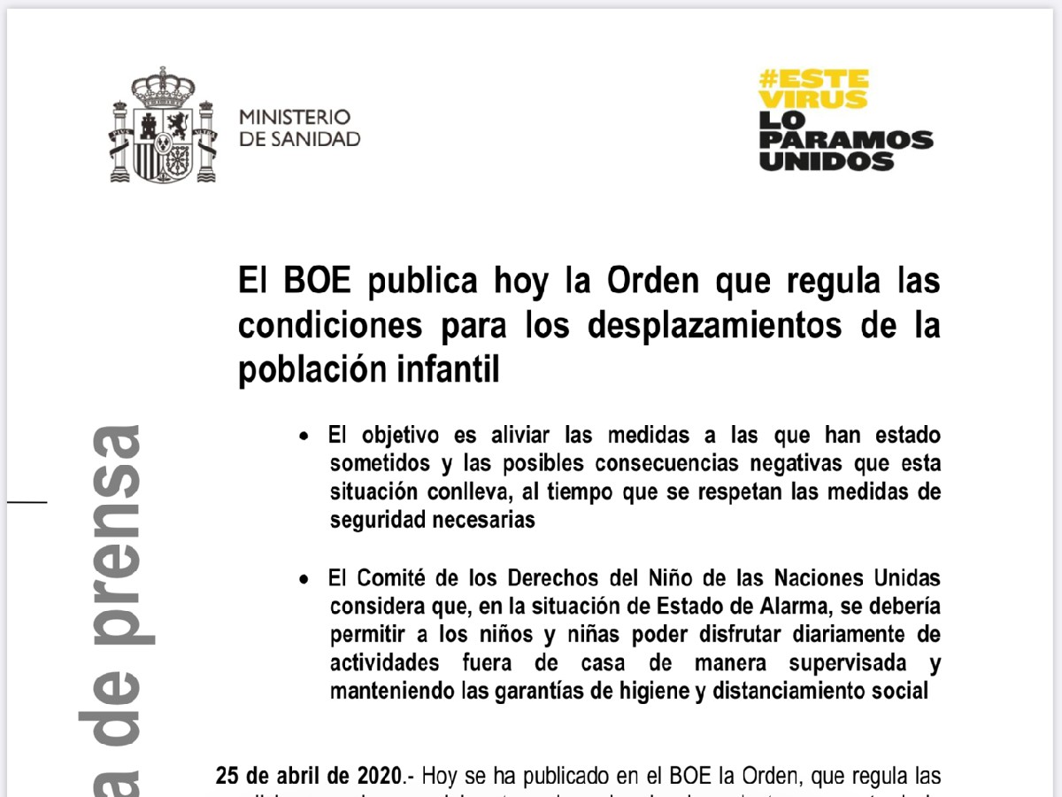 Sanitat publica al BOE els detalls de les sortides amb nens: de 9 a 21, màxim una hora i a 1 quilòmetre de casa. Els menors podran estar acompanyats per un pare, mare, tutor o un empleat de la llar o domèstic