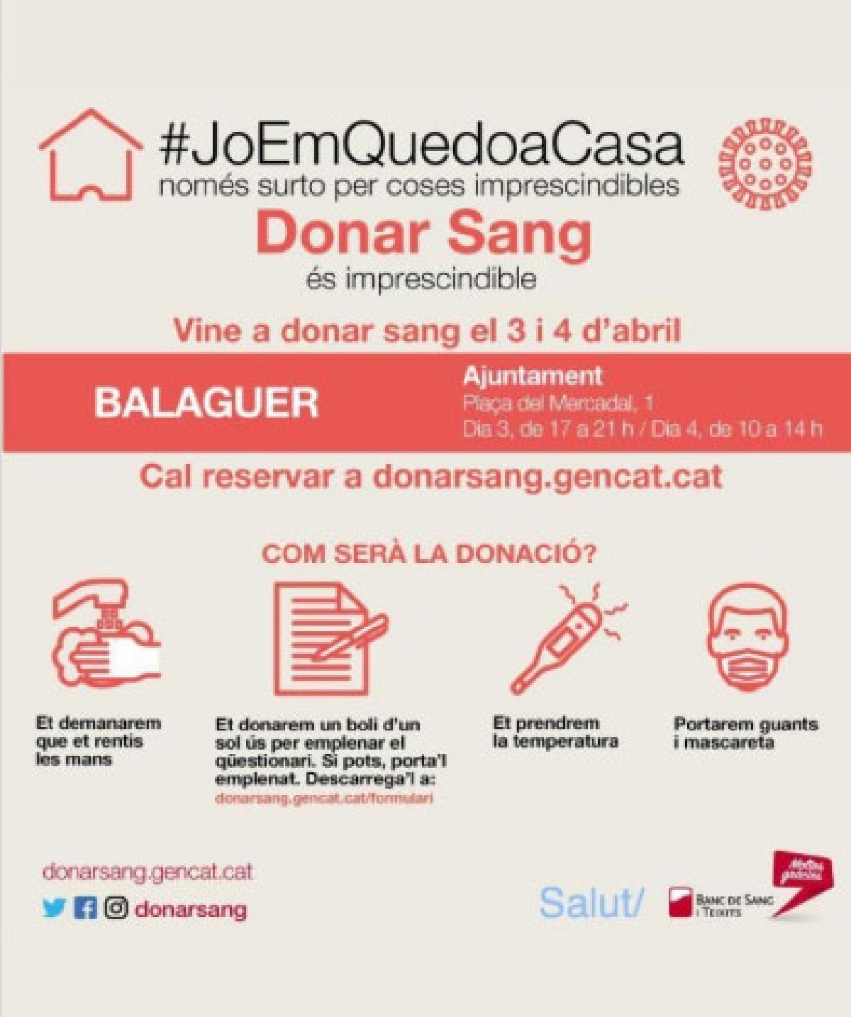 La Casa de la Paeria de Balaguer acollirà aquest divendres i dissabte 3 i 4 d'abril una donació de sang. Com a mesura excepcional, cal reservar hora abans d'anar-hi.
