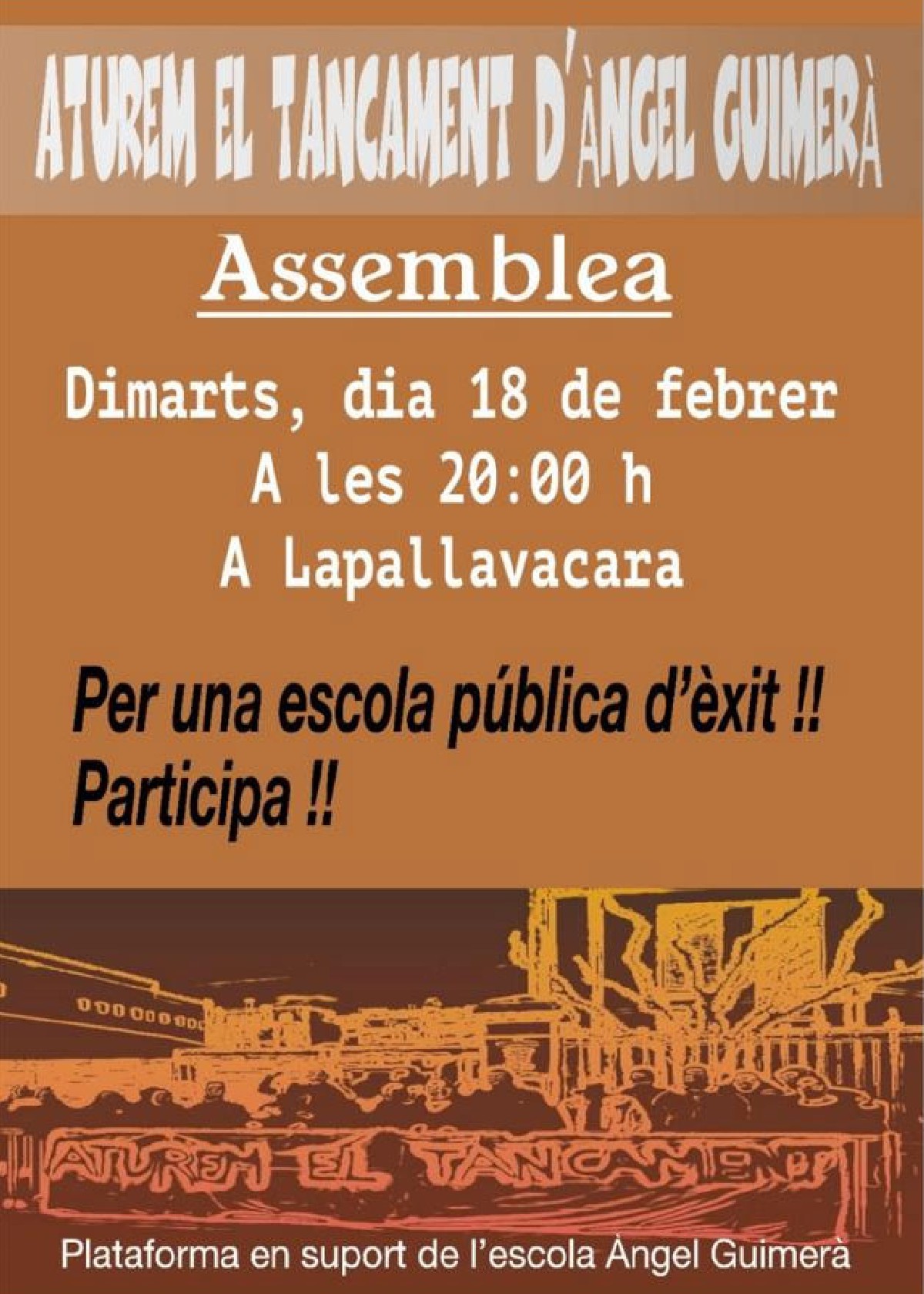 La Plataforma en suport de l'escola Àngel Guimerà de Balaguer ha convocat una assemblea oberta aquest dimarts 18 de febrer a les 8 del vespre al casal Lapallavacara.