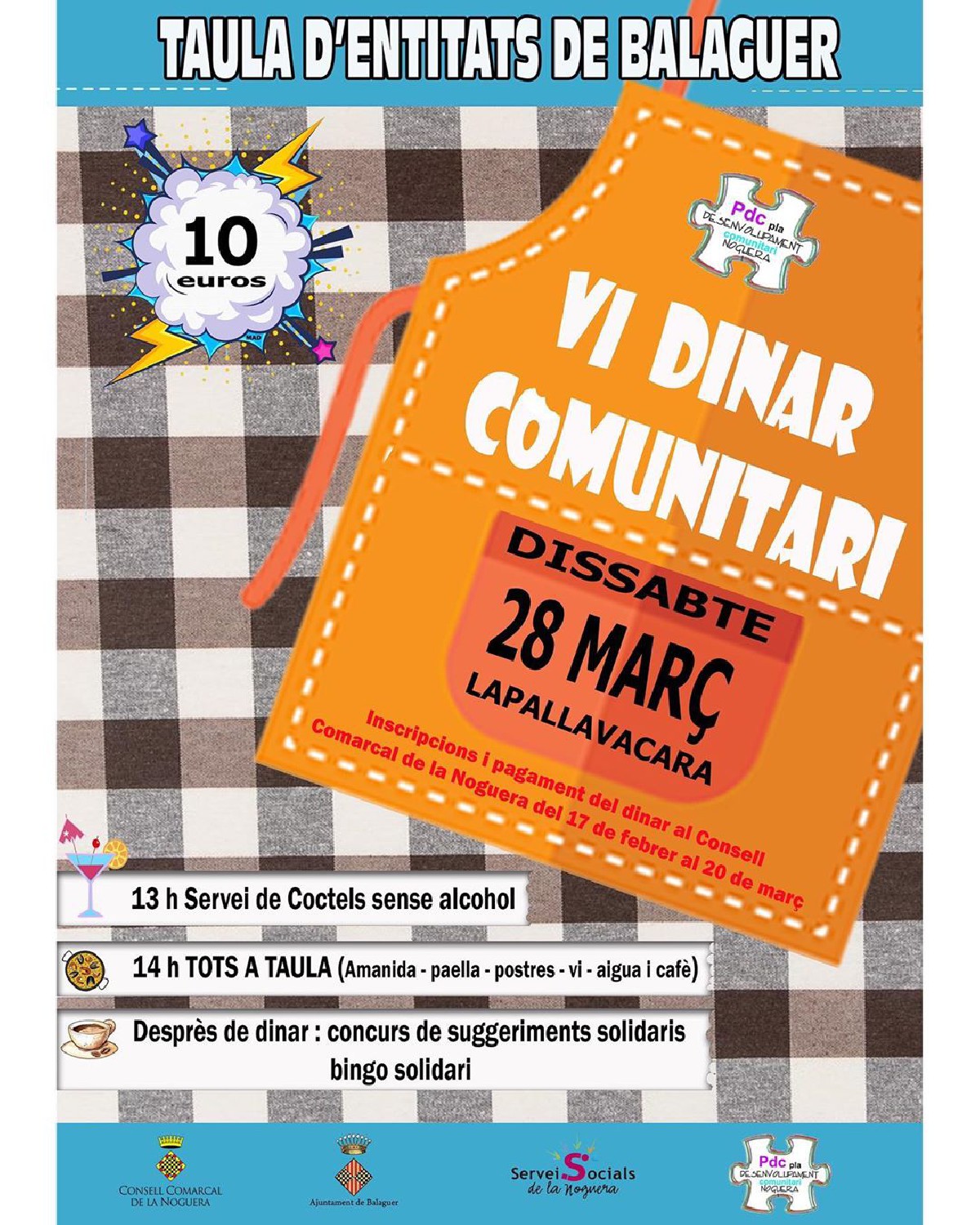 L'Àrea de Serveis Socials del Consell Comarcal de la Noguera, a través de la Taula d'Entitats de Balaguer del PDC, ha organitzat el dissabte 28 de març el VI Dinar Comunitari, al Casal La Pallavacara, a partir de les 13h.