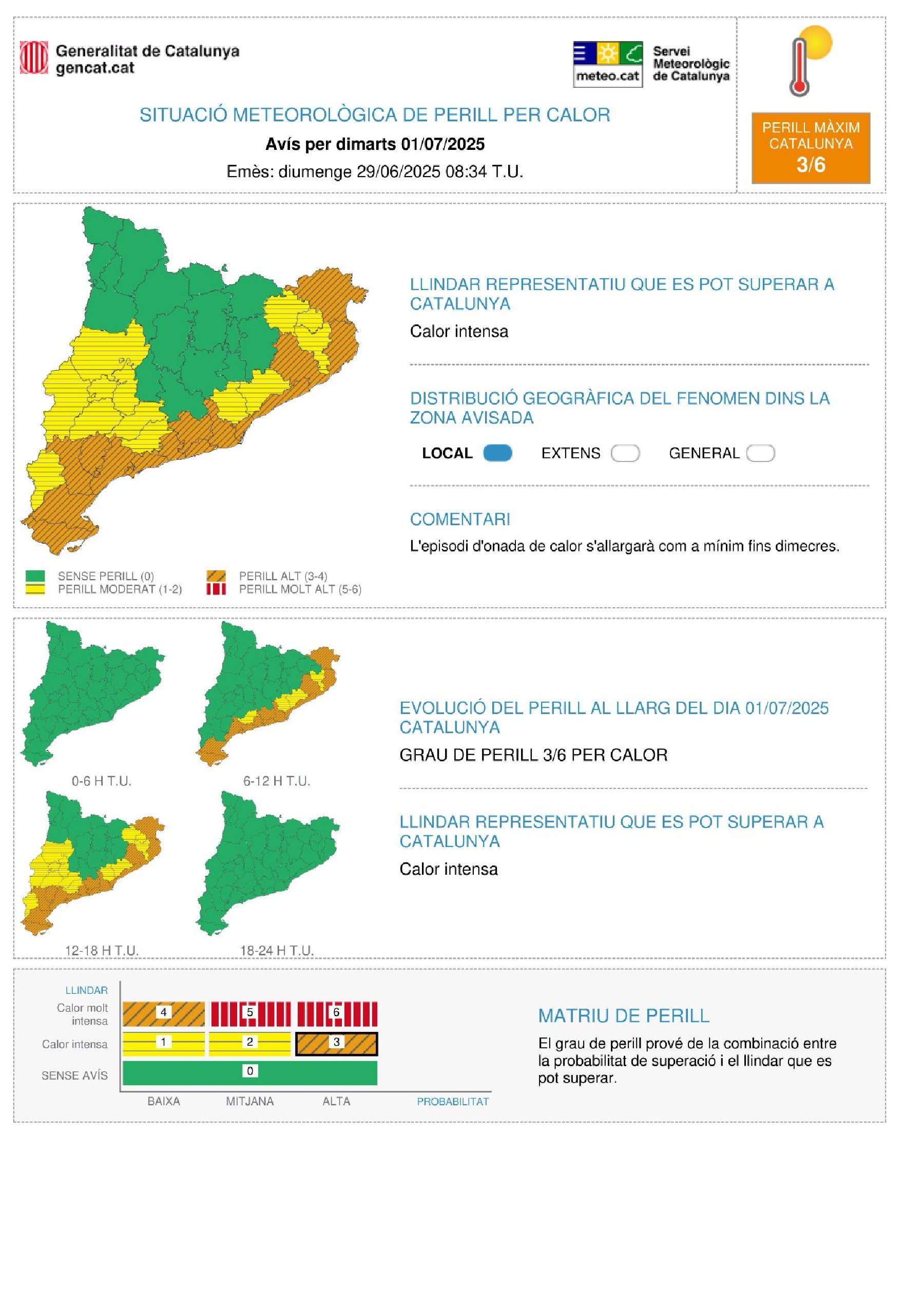Protecció Civil allarga fins dijous l'alerta del Procicat per l'episodi de calor intensa amb avisos diürns i nocturns. Aquest dimarts es preveuen temperatures extremes a moltes comarques però la calor diürna començaria a afluixar dimecres