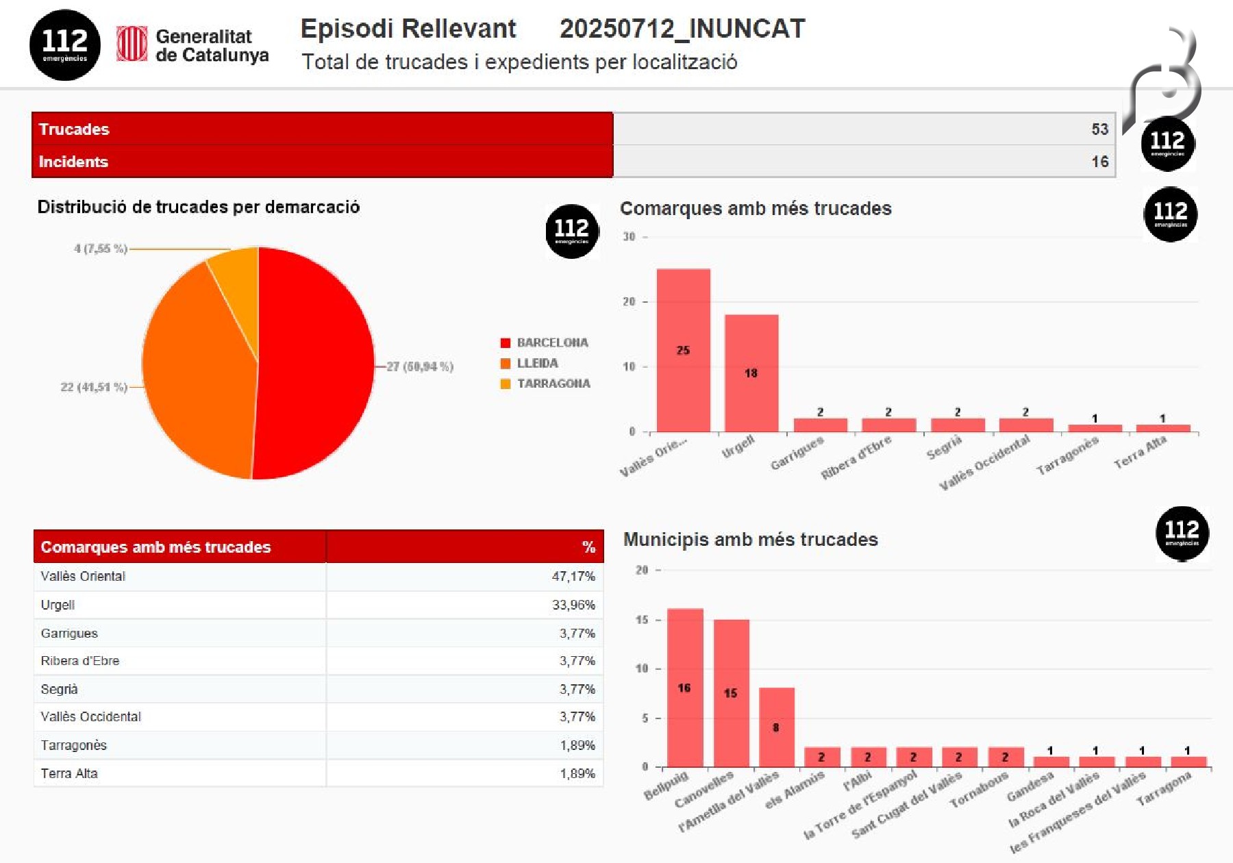 Els Bombers reben més de 1.000 avisos pel temporal des de l'inici de l'episodi de pluges. El 112 ha atès 1.488 trucades relacionades amb el temporal