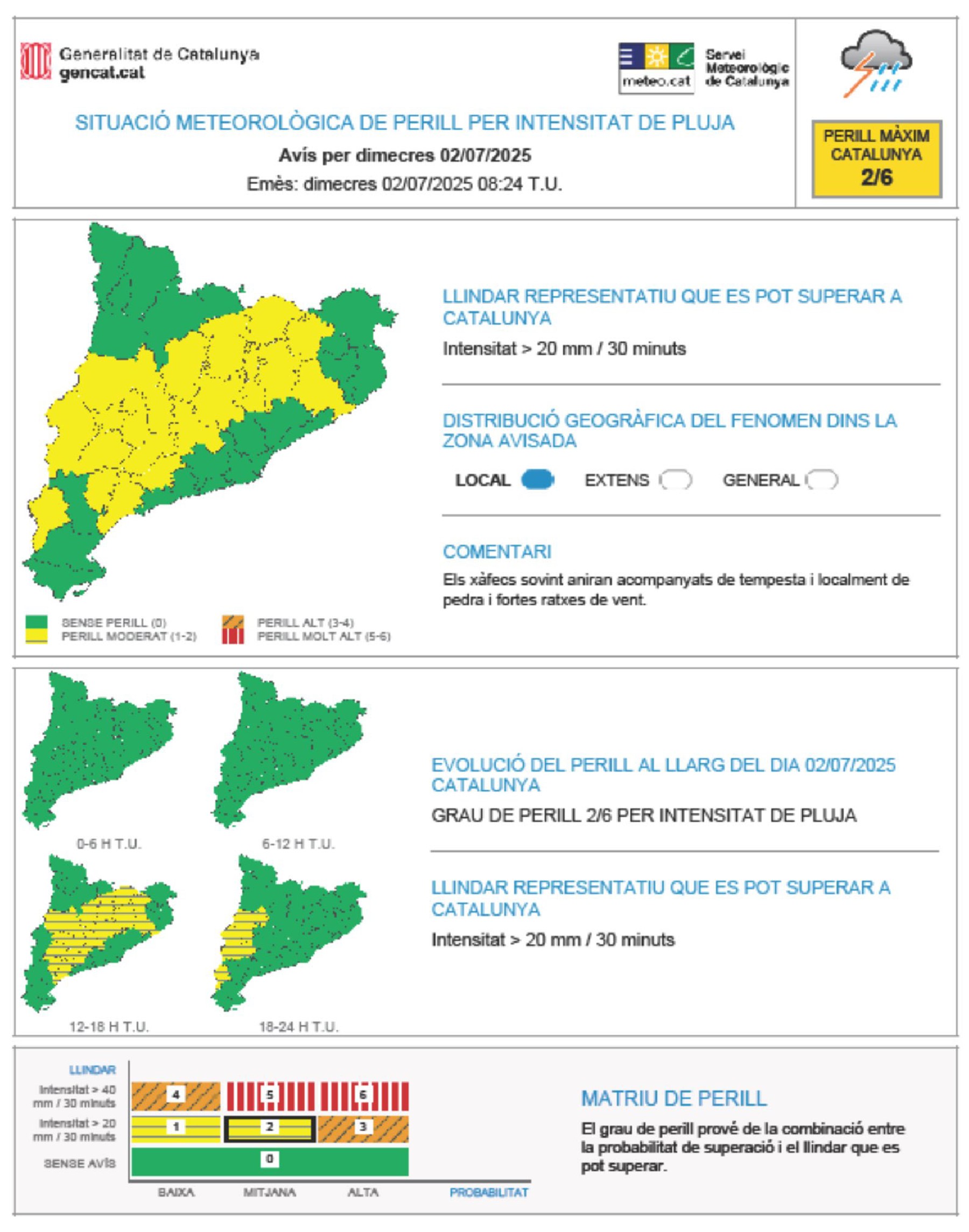Protecció Civil demana màxima prudència per la previsió de pluges intenses divendres i dissabte a diverses comarques. S'espera una situació més complicada dissabte, quan es poden superar els 40 l/m2 en mitja hora