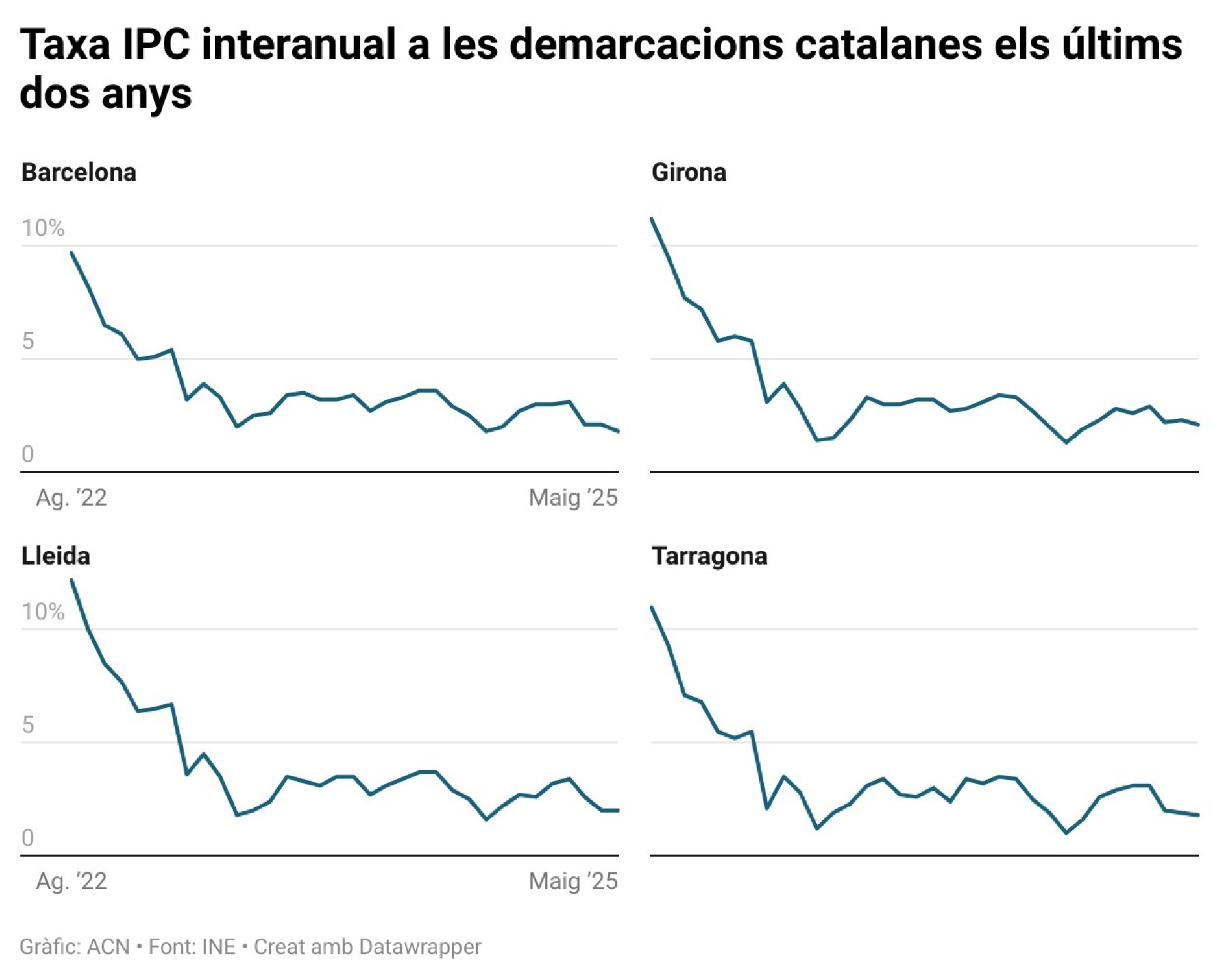 La inflació a Catalunya es modera tres dècimes al maig i se situa en l'1,8%, el nivell més baix des de setembre passat. Al conjunt de l'Estat, l'IPC va ser del 2% pel descens dels preus dels paquets turístics i de l'electricitat