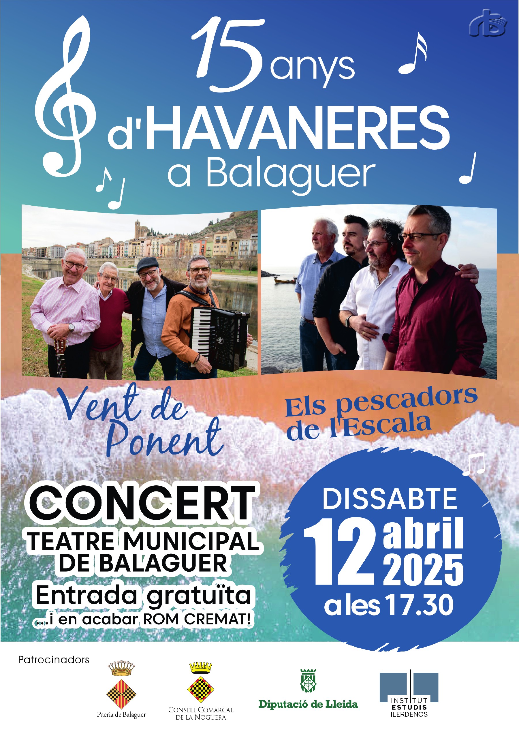 Aquest concert de celebració dels 15 anys del grup d'havaneres Vent de Ponent es farà el  dissabte 12 d'abril, a les 17.30 h, al Teatre Municipal de Balaguer. L'entrada és gratuïta, i en acabar oferiran rom cremat per a tothom.