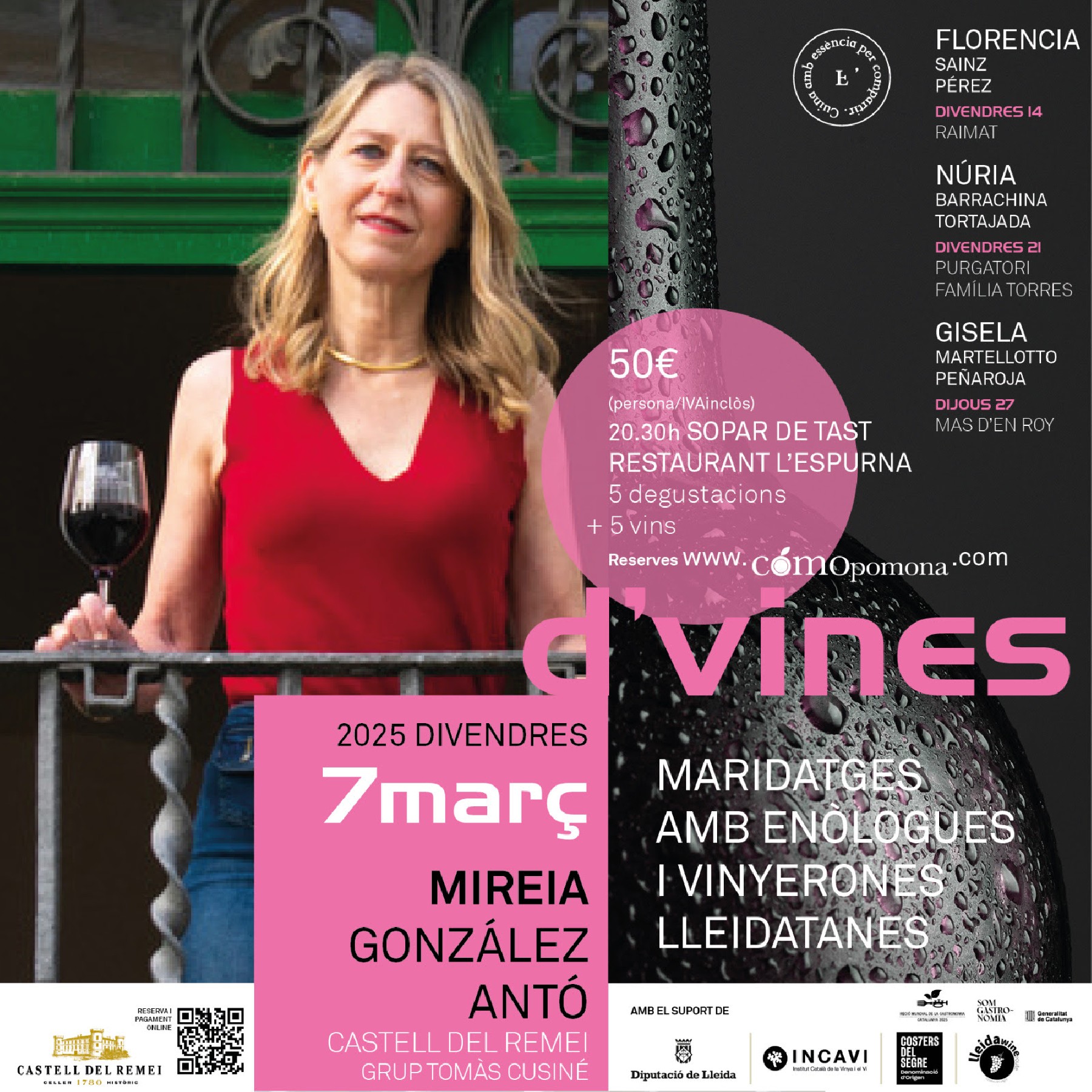 Sopar maridatge amb Mireia González Antó: La presidenta de la Fundació Castell del Remei participarà en un sopar maridatge al restaurant L'Espurna de Lleida, el divendres 7 de març a les 20.30 h. Una experiència gastronòmica única amb plats harmonitzats amb vins del celler.