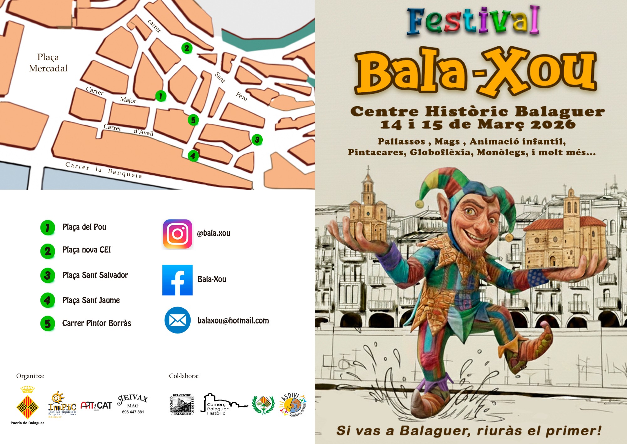 El centre històric de Balaguer acollirà els dies 14 i 15 de març el festival Bala-xou, una proposta cultural i familiar que oferirà una variada programació d'espectacles d'humor, arts escèniques i animació infantil
