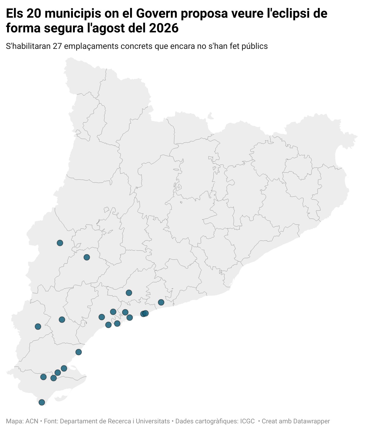 El Govern proposa 27 emplaçaments segurs per veure l'eclipsi de l'agost vinent amb capacitat per a 85.200 persones. Un dispositiu de Procicat farà seguiment de la mobilitat i riscos, i es prepara una campanya per evitar danys a la vista