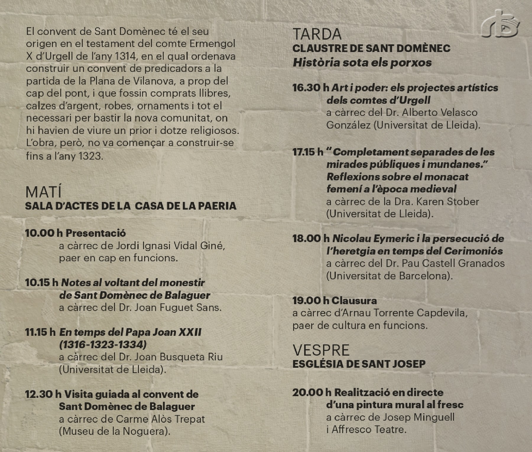 A 2/4 de 5 de la tarda, es farà l'activitat 'Història sota els porxos' al claustre del convent de Sant Domènec, amb ponències a càrrec del Dr. Alberto Velasco, la Dra. Karen Stober, ambdós de la Universitat de Lleida; i el Dr. Pau Castell, de la Universitat de Barcelona.