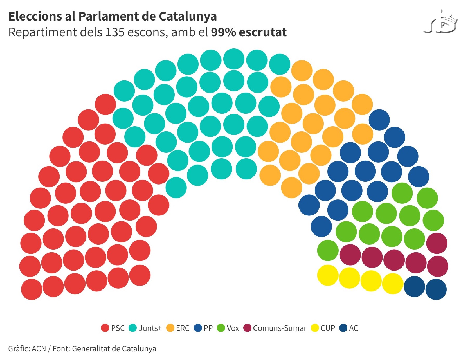 El PSC guanya amb 42 escons i Junts se situa en segona posició superant ERC per 15, amb el 99% escrutat. Els republicans perden 13 diputats i Aliança Catalana entra al Parlament amb 2