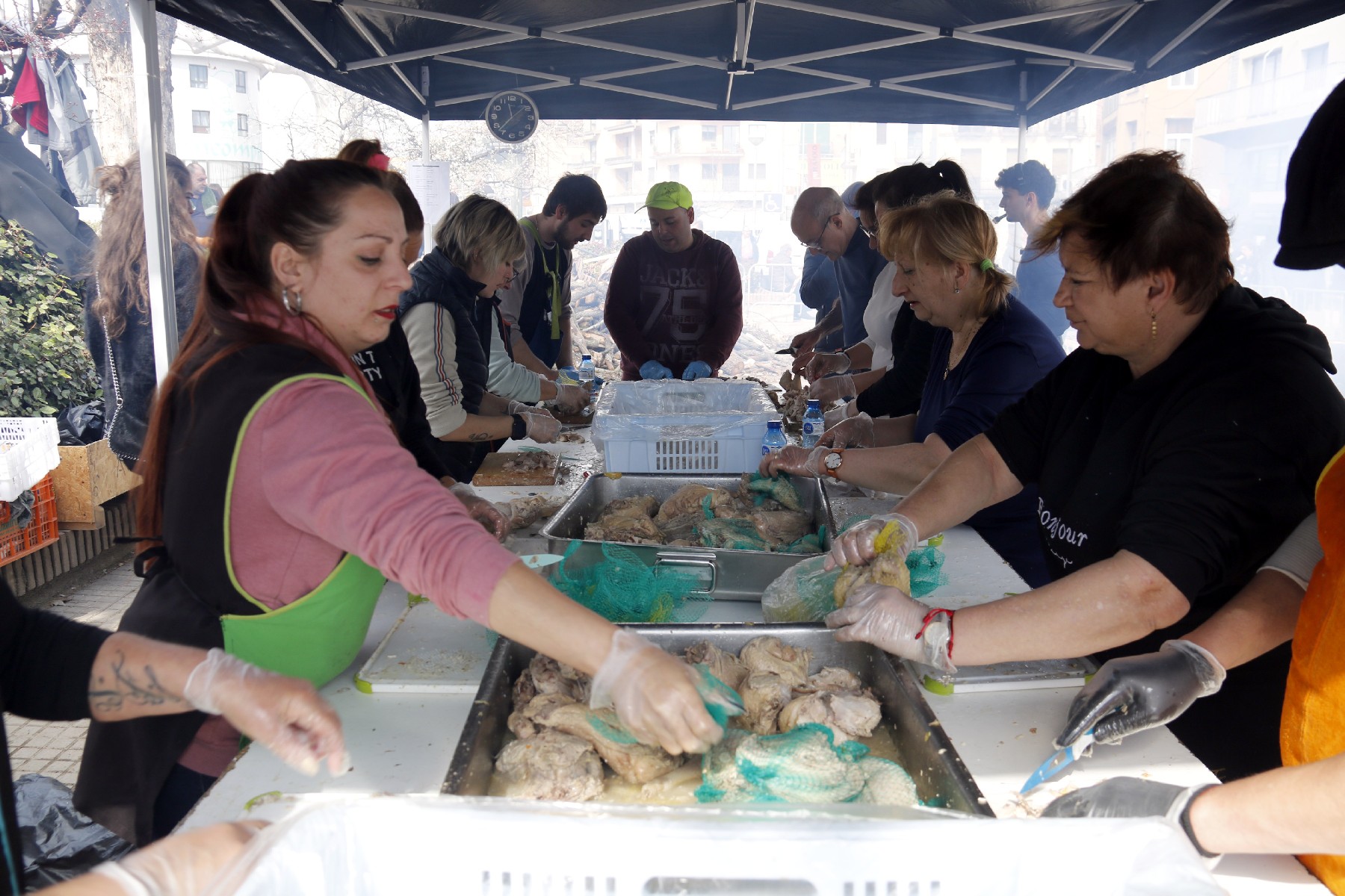 Les 60 calderes es posen al foc de lleny a les 6 del matí i s'hi estan més de 8 hores, fins que cap a les dues de la tarda els cuiners comencen a repartir el ranxo als els veïns i visitants. Per elaborar el ranxo es necessiten, entre altres, 200 quilos de pollastre, 40 gallines, 100 quilos de mongetes, 130 quilos de botifarra negra i 80 quilos de fideus i d'arròs.