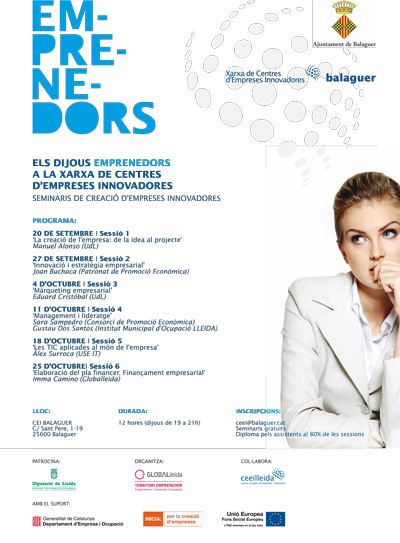 Les sessions s'impartiran els dies 20 i 27 de setembre i 4, 11, 18 i 25 d'octubre de 19 a 21 hores, a la seu del viver d'empreses de Balaguer, al carrer Sant Pere.