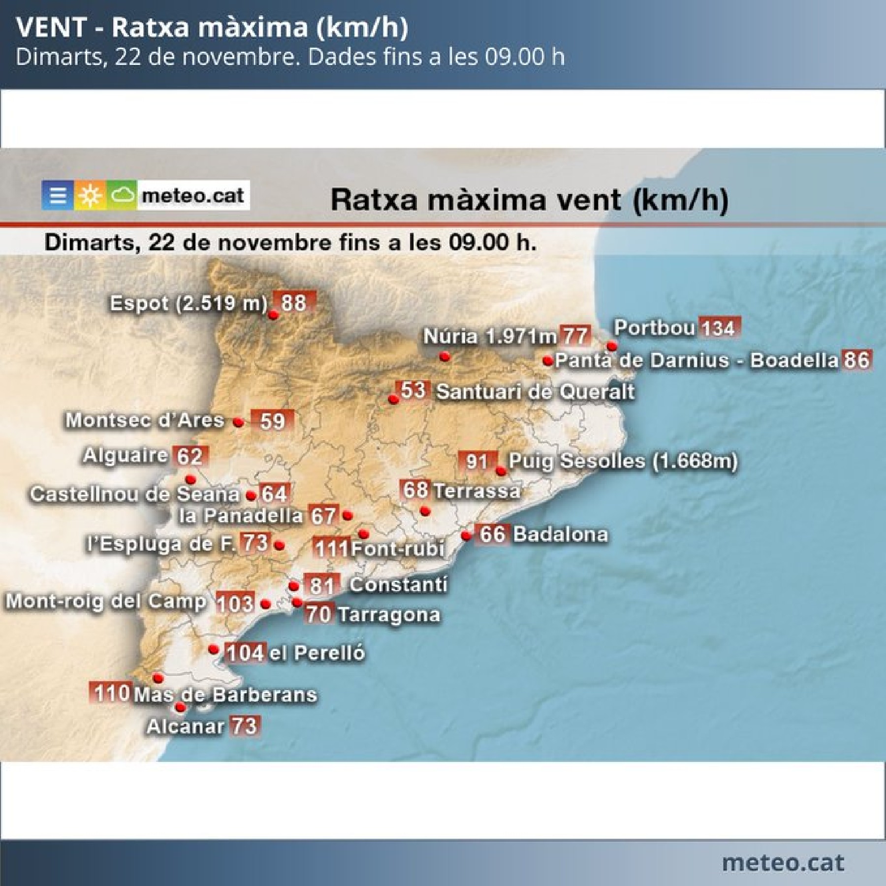 Segons informa Protecció Civil, aquest dimarts a la matinada a Portbou (Alt Empordà) s'han registrat ratxes de vent de 117,7 km/h; a Mas de Barberans (Montsià), de 113,8; al Perelló (Baix Ebre), de 112,7; a Mont-roig del Camp (Baix Camp), de 97,7 i a Font-rubí (Alt Penedès), 83,2.