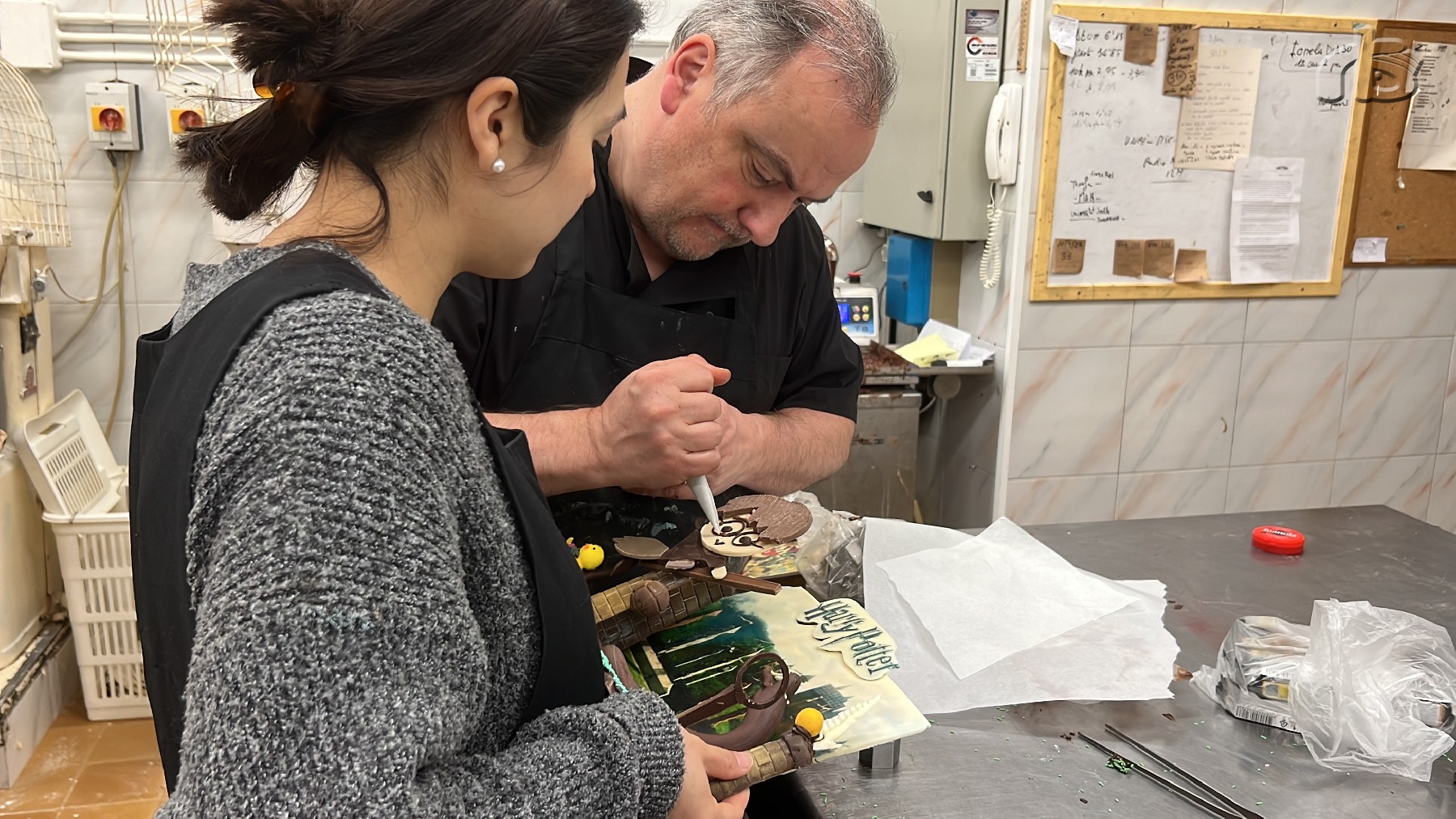 Pere Graells explica que cada cop torna més el crocant o guirlache, una tècnica antiga de fer les figures amb sucre caramel·litzat i ametlla. Aquest any n'han elaborat per encàrrec una de ben especial. Una figura de la Torre Eiffel per repetir una fotografia feta ara fa 73 anys, amb el que llavors era un nen, i va rebre aquesta figura per la seva Mona.