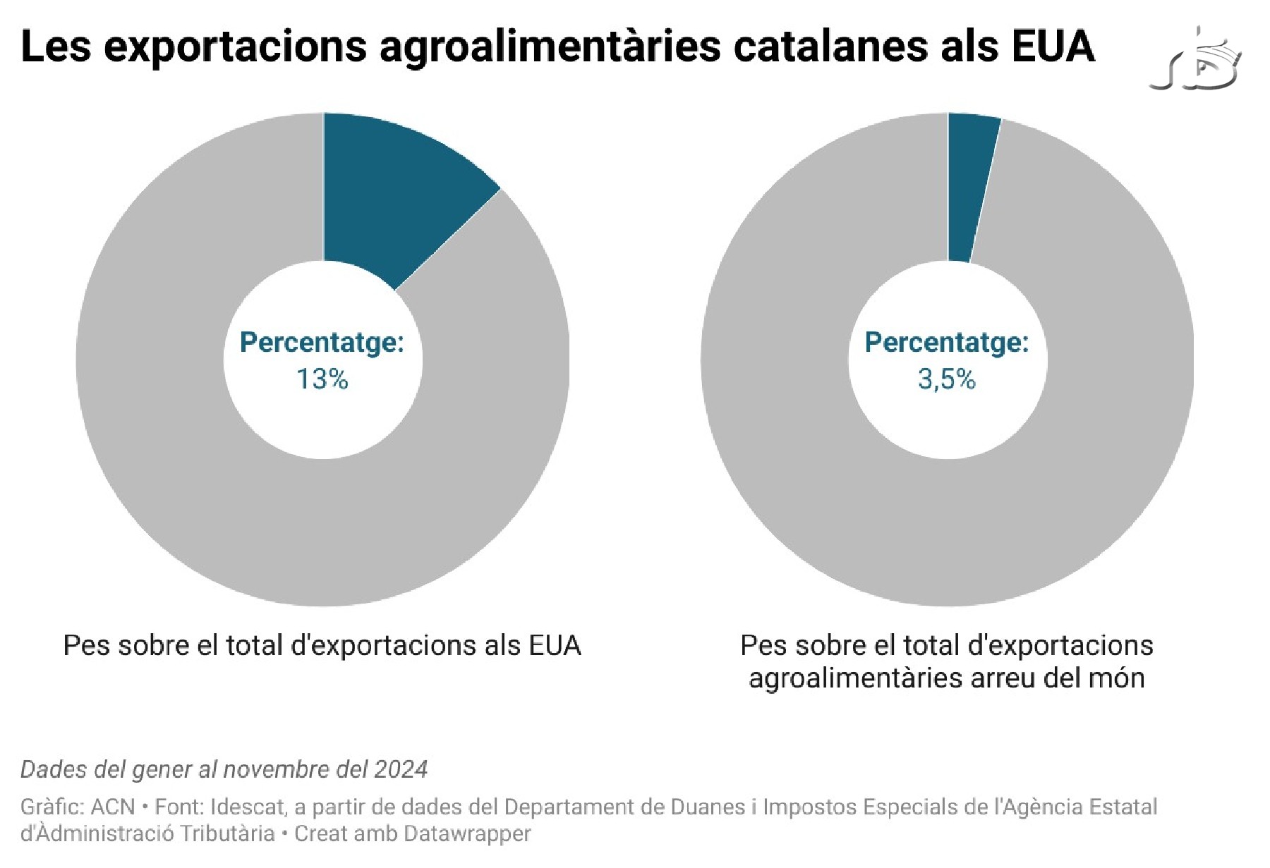 L'impacte de la imposició d'aranzels per part dels Estats Units als productes europeus manté el sector agroalimentari català "a l'expectativa". Així ho constaten algunes empreses consultades per l'ACN com la gironina Galetes Trias; la lleidatana Fruites Font; el celler Alta Alella i el productor d'oli ebrenc Faiges, que destaca que al 2019 ja es va imposar un gravamen del 25%. Els productes més afectats podrien ser l'oli d'oliva i el vi amb un impacte que podria arribar als 45 milions, segons els càlculs de Prodeca. Tot i que les exportacions dels productes agroalimentaris superaran els 500 milions al 2024 als EUA, un informe de Prodeca advertia de la reducció de marges i la necessitat de diversificar cap a altres països.