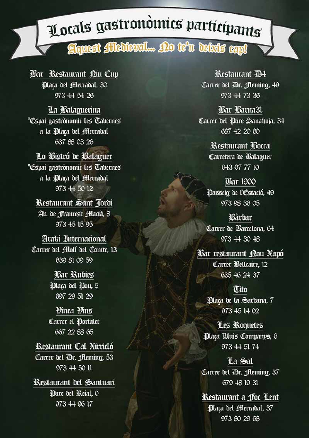 Una de les novetats d'enguany és l'activitat Tapegem... per Balaguer! Es tracta d'una iniciativa on hi participaran una vintena de bars i restaurants de la ciutat, que prepararan des d'avui dijous i fins diumenge una tapa o un plat d'origen medieval per tal d'assaborir aquest gust per tota la ciutat i convertir-la en una experiència gastronòmica arreu de la ciutat.