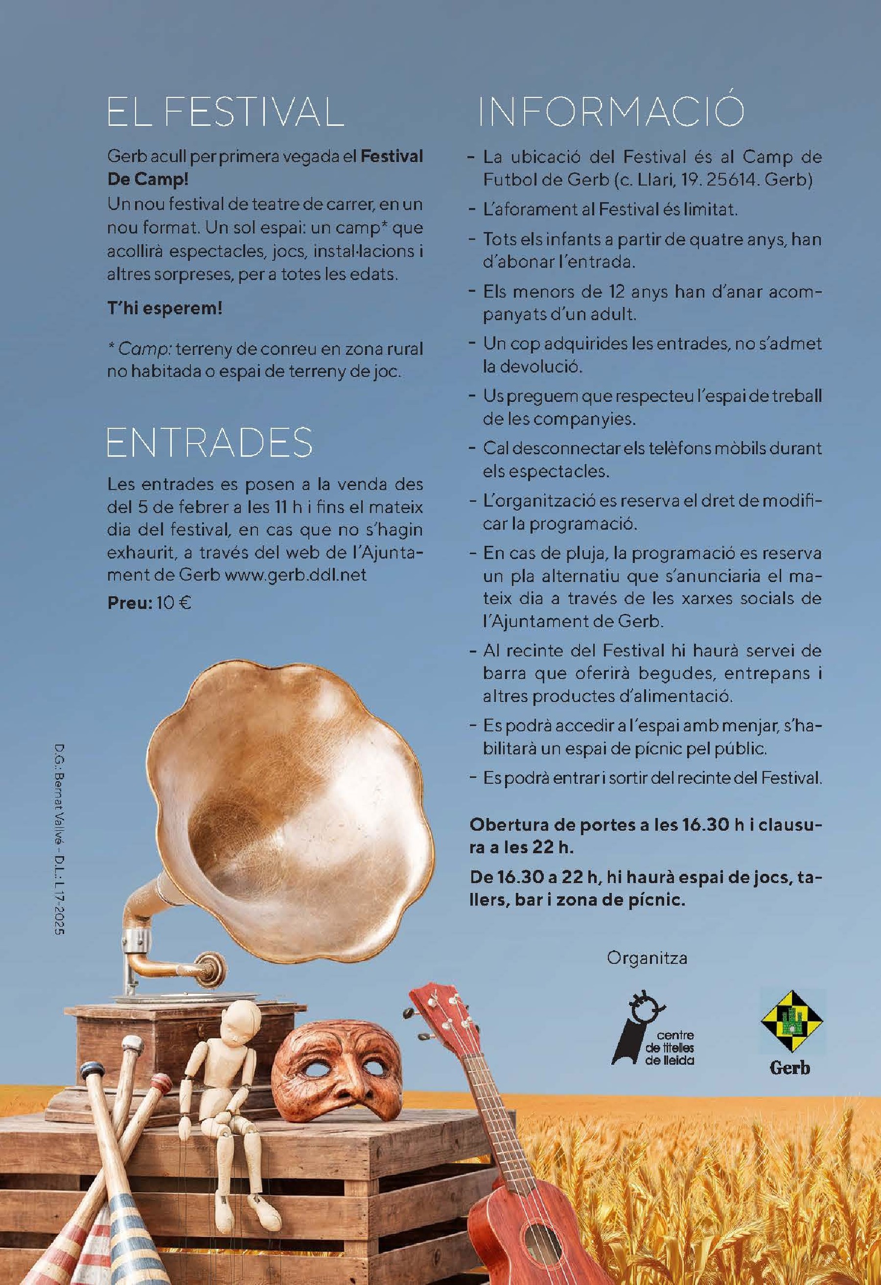 Les entrades estan a la venda a la web de l'Ajuntament de Gerb. El preu és de 10 euros i es podran adquirir fins al mateix dia del festival, sempre que no s'hagin exhaurit. L'activitat es durà a terme al Camp de Futbol de Gerb, amb aforament limitat.