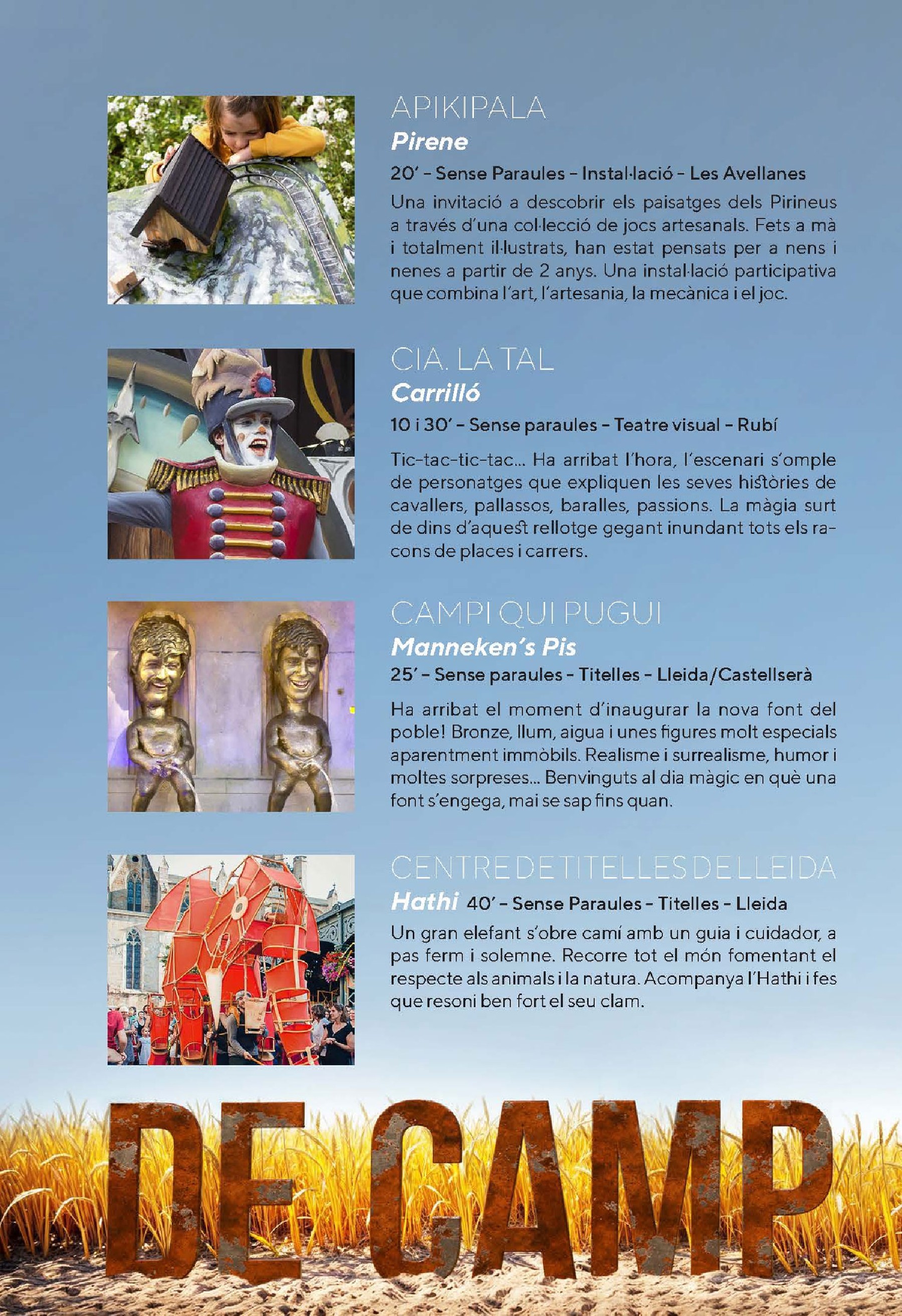 El Festival De Camp comptarà amb un programa d'actuacions d'alt nivell, amb companyies de renom que oferiran espectacles de titelles, teatre visual, instal·lacions interactives i molt més. Les actuacions es faran en diferents punts del camp de futbol, i a més, hi haurà espais amb jocs de fusta, tallers de pintura i manualitats.