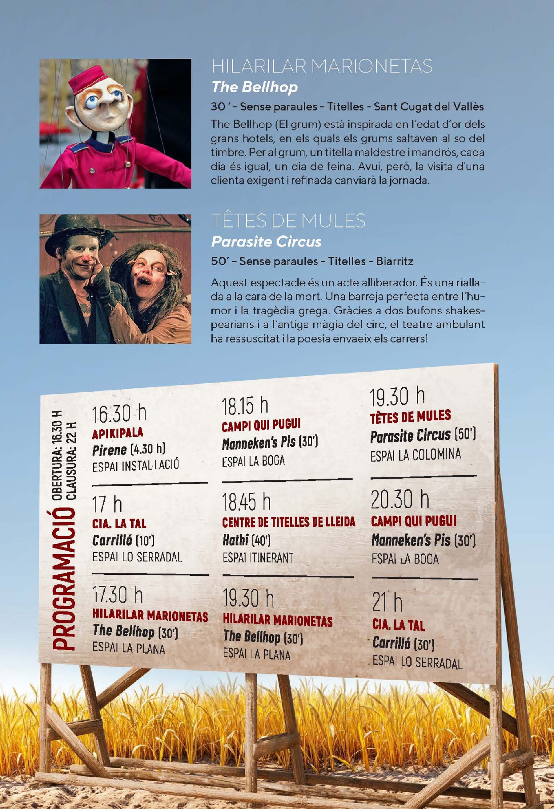 - Finalment TÊTES DE MULES hi portarà Parasite Circus, una barreja única d'humor, tragèdia i teatre de carrer, amb bufons shakesperians i màgia circense. Serà en un únic passi a les 19.30h.
