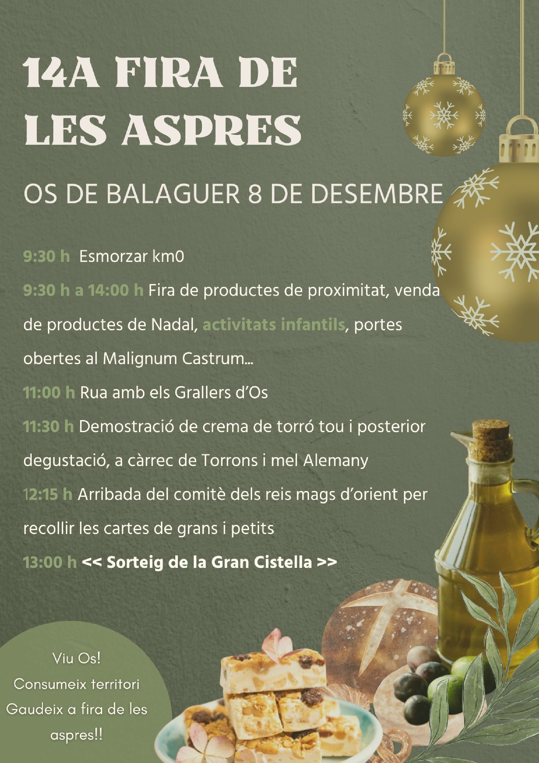 El pròxim diumenge, 8 de desembre, Os de Balaguer acollirà la 14a edició de la Fira de les Aspres, un esdeveniment tradicional que reuneix productes locals, activitats familiars i una gran dosi de solidaritat.